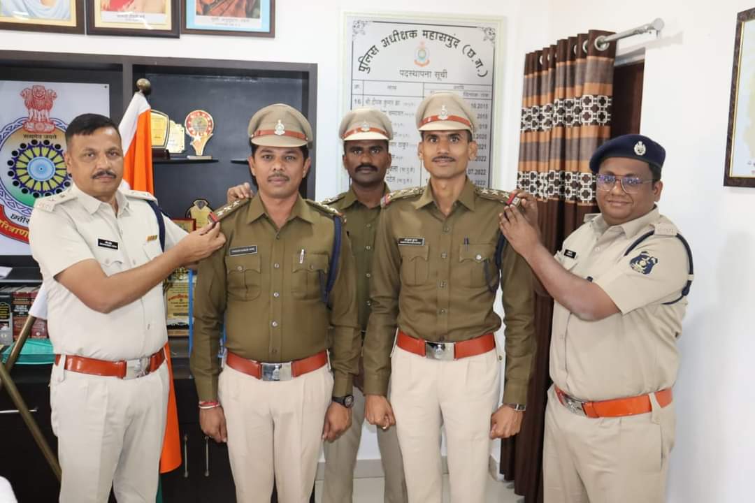 Mahasamund News: निरीक्षक बनने पर पुलिस अधीक्षक धर्मेंद्र सिंह ने स्टार लगाकर दी बधाई