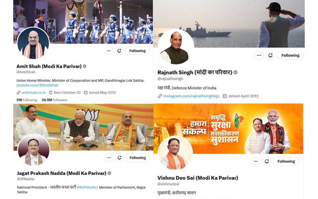 नई दिल्ली । केंद्रीय गृह मंत्री अमित शाह और भाजपा अध्यक्ष जेपी नड्डा समेत कई वरिष्ठ नेताओं ने सोशल मीडिया पर अपना बायो बदल लिया है। भाजपा नेताओं ने अपने बायो में नाम के आगे ‘मोदी का परिवार’ लिख लिया है। पीएम मोदी के साथ एकजुटता दिखाने के लिए ऐसा किया गया है। दरअसल रविवार को बिहार में जन विश्वास महारैली के दौरान राजद नेता लालू प्रसाद यादव ने परिवारवाद के मुद्दे पर पीएम मोदी पर निशाना साधा था। उसी के पलटवार में भाजपा नेताओं ने ये रणनीति अपनाई है। जिसके बाद छत्तीसगढ़ के मुख्यमंत्री विष्णुदेव साय ने भी अपने X अकॉउंट पर मैं भी मोदी का परिवार लिख दिया है।