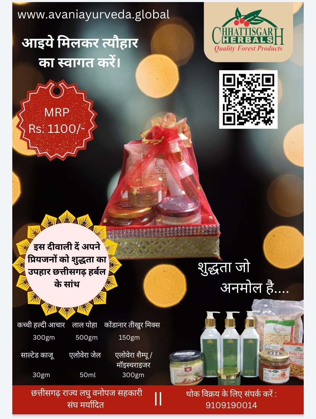 कोरबा 22 अक्टूबर I दीवाली के पावन अवसर पर अपने प्रियजनों को शुद्धता का उपहार देने के लिए शुद्ध उत्पादों का गिफ्ट हैंपर सी मार्ट में उपलब्ध है। छत्तीसगढ़ हर्बल द्वारा निर्मित शुद्ध उत्पादों का गिफ्ट हैंपर आकर्षक कीमत में टीपी नगर स्थित सी मार्ट तथा कोसाबाड़ी स्थित संजीवनी मार्ट में उपलब्ध है। इनमें कच्ची हल्दी के अचार 300 ग्राम, लाल पोहा 500 ग्राम, कोंडानार तिखुर मिक्स 150 ग्राम, साल्टेड काजू 30 ग्राम, एलोवेरा जेल 50 मिलीलीटर, एवं एलोवेरा शैंपू – मॉश्चराइजर 300 ग्राम युक्त गिफ्ट हैंपर 1100 रुपए में उपलब्ध है।