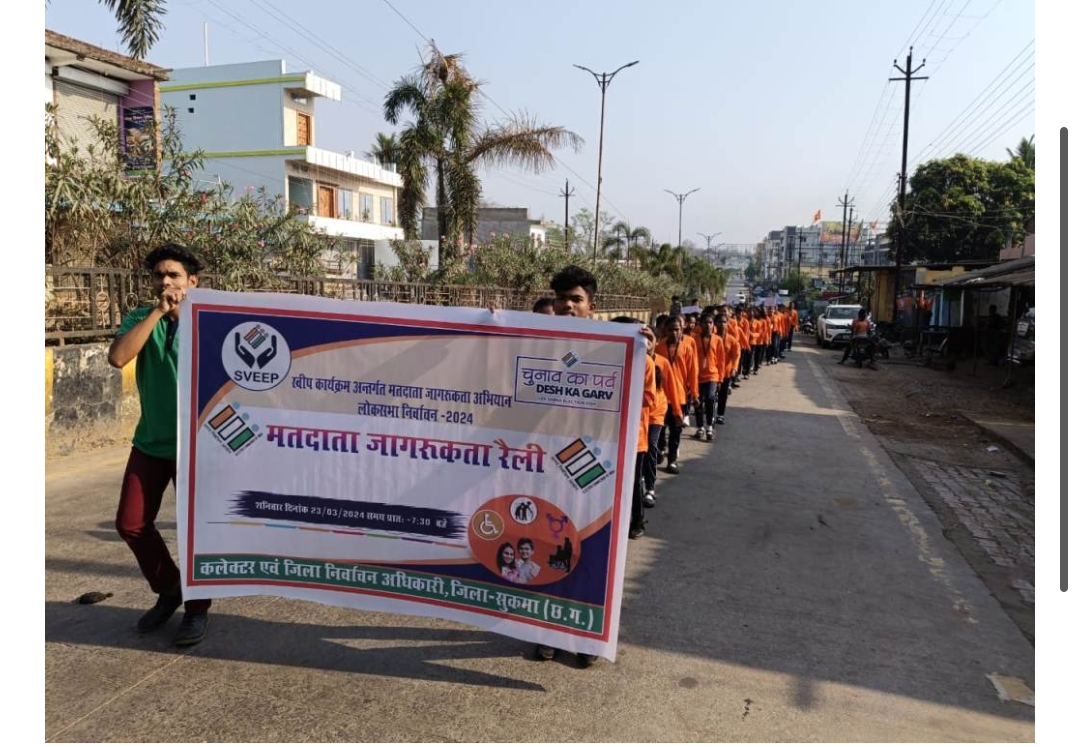 इसी क्रम में जिला मुख्यालय, ब्लॉक एवं नगरीय निकायों में मतदाता जागरूकता रैली का आयोजन किया गया। जिला मुख्यालय सुकमा में दंतेवाड़ा चौक से सुकमा मिनी स्टेडियम के मध्य मतदाता जागरूकता रैली का आयोजन किया गया। इस अवसर पर डिप्टी कलेक्टर मधु तेता ने हरी झंडी दिखाकर मतदाता रैली को रवाना किया। इस अवसर पर तहसीलदार सुकमा परमेश्वर मांडवी, उपसंचालक समाज कल्याण संजय पांडे, शिक्षा विभाग श्री डेनियल, आशीष राम, महेश नागरची एवं अन्य अधिकारी कर्मचारी के साथ-साथ स्कूली छात्र-छात्राएं शामिल हुई। जागरूता रैली का समापन मिनी स्टेडियम सुकमा के प्रांगण में हुआ जिसमें मतदाता जागरूकता संबंधी शपथ भी ली गई एवं आगामी लोकसभा निर्वाचन 2024 मतदान तिथि 19 अप्रैल 2024 दिन शुक्रवार को शत प्रतिशत मतदान हेतु प्रेरित किया गया। इस दौरान हाथों में बैनर पोस्टर लेकर नारों की गूंज के साथ छात्र-छात्राओं अधिकारियों एवं शिक्षक-शिक्षिकाओं ने आम नागरिकों मतदाता जागरूकता का संदेश देकर मतदान करने के लिए प्रेरित किया।