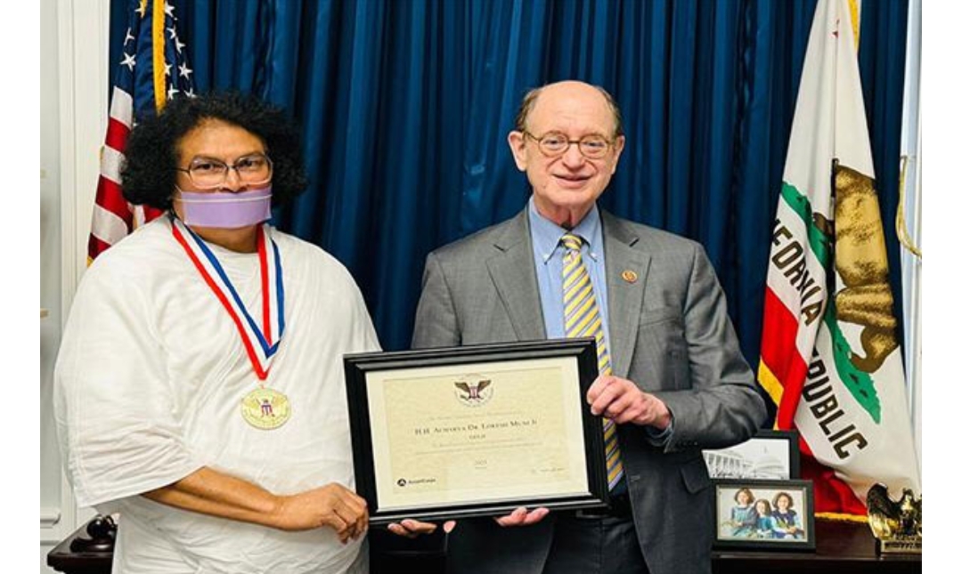 वाशिंगटन । अहिंसा विश्व भारती और विश्व शांति केंद्र के संस्थापक जैन आचार्य लोकेश मुनि को अमरीका में वाशिंगटन डी सी के कैपिटल हिल में अमेरिकी राष्ट्रपति पुरस्कार से सम्मानित किया गया। वह अमेरिकी राष्ट्रपति पुरस्कार से सम्मानित होने वाले पहले भारतीय भिक्षु हैं।