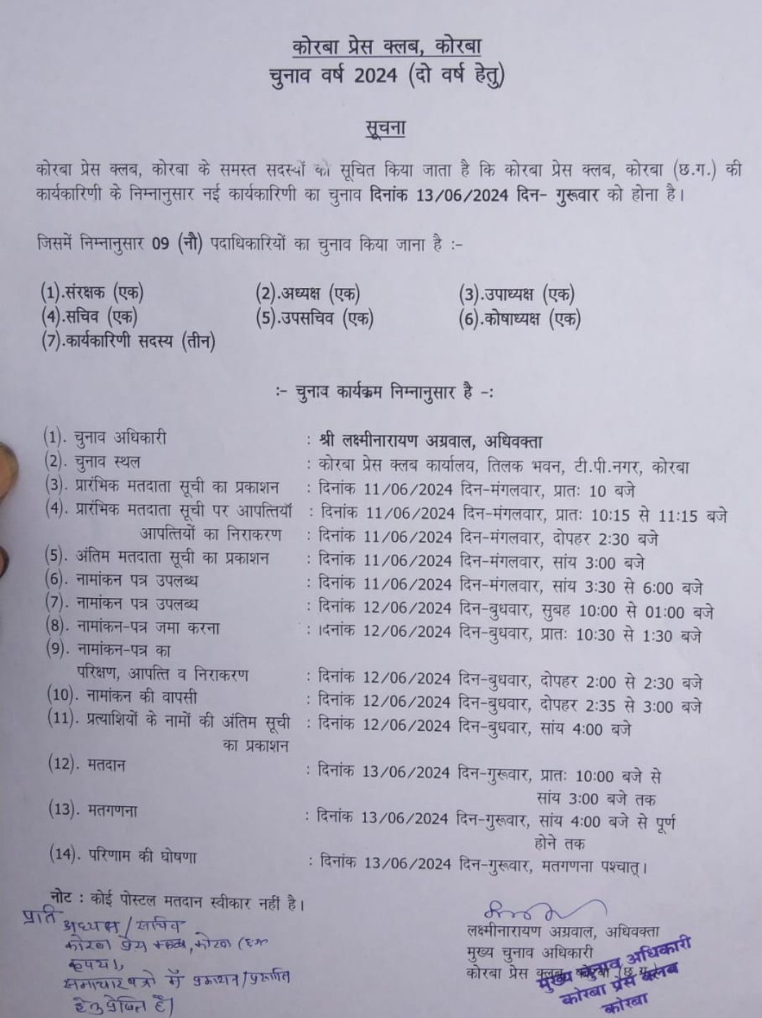 कोरबा प्रेस क्लब के द्विवर्षीय कार्यकारिणी चयन के लिए मुख्य चुनाव अधिकारी ने किया चुनाव कार्यक्रम जारी