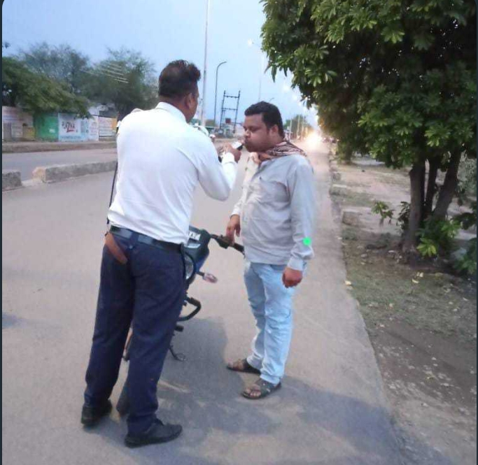 यातायात पुलिस द्वारा वाहन चेकिंग के दौरान भविष्य में यातायात नियमों का पालन करने एवं शराब पीकर वाहन नही चलाने के संबंध में समझाईस दी जा रही है।