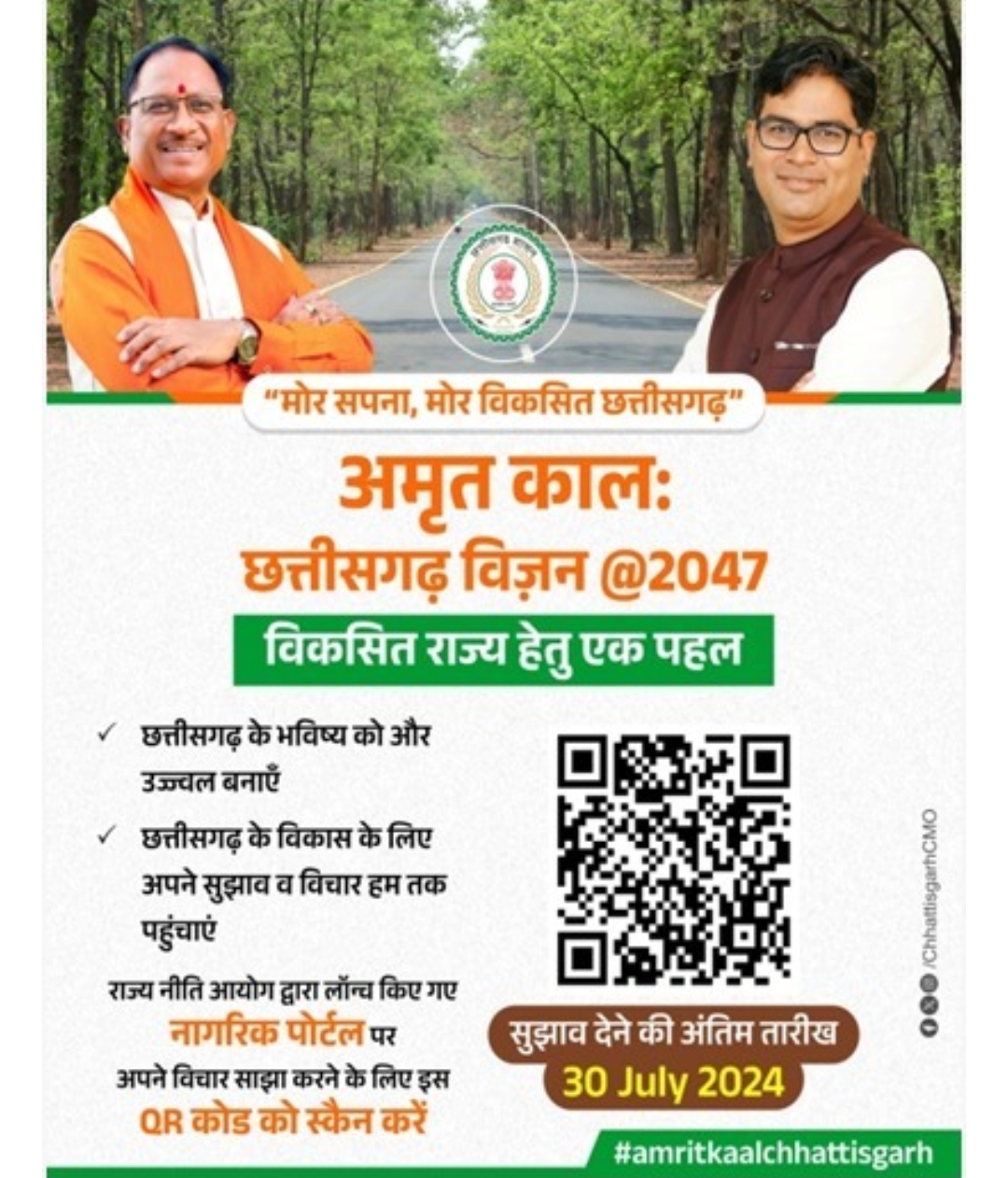 ‘‘अमृतकाल रू छत्तीसगढ़ विजन /2047‘‘ डाक्यूमेंट को सर्वसमावेशी बनाये जाने के उद्देश्य से सर्व जनसामन्य से सूझाव आमंत्रित करने के लिए नीति आयोग द्वारा नागरिक पोर्टल ‘‘मोर सपना मोर विकसीत छत्तीसगढ‘‘ प्रारूप तैयार किया गया है। लिंक पर जा कर या क्यूआर कोड स्कैन कर ‘‘अमृतकाल रू छत्तीसगढ़ विजन / 2047‘‘ पर 30 जुलाई 2024 तक जनसामान्य द्वारा अपने सुझाव प्रेषित किये जा सकते है।