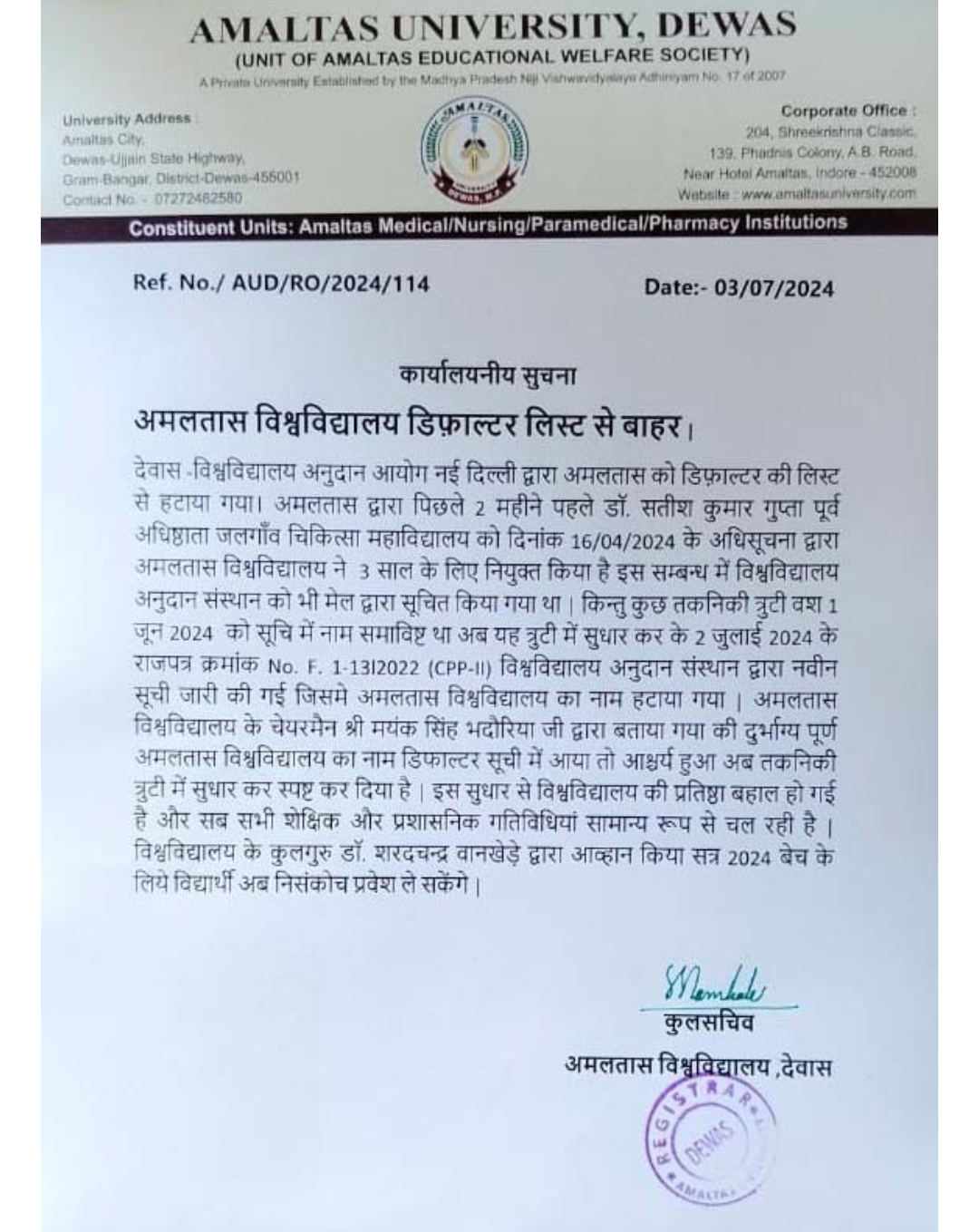 देवास। विश्वविद्यालय अनुदान आयोग नई दिल्ली द्वारा अमलतास को डिफॉल्टर की लिस्ट से हटा दिया गया है। अमलतास द्वारा दो महीने पहले 16 अप्रैल के अधिसूचना द्वारा डॉ. सतीश कुमार गुप्ता, पूर्व अधिष्ठाता जलगाँव चिकित्सा महाविद्यालय को अमलतास विश्वविद्यालय ने तीन साल के लिए नियुक्त किया है। इस संबंध में, विश्वविद्यालय अनुदान संस्थान को भी मेल द्वारा सूचित किया गया था, किन्तु कुछ तकनिकी त्रुटी वश 1 जून, 2024 को सूचि में नाम समाविष्ट था। अब यह त्रुटी में सुधार करके 2 जुलाई के राजपत्र क्रमांक एफ 1-13l2022 (सीपीपी-II) विश्वविद्यालय अनुदान संस्थान द्वारा नवीन सूची जारी की गई, जिसमें अमलतास विश्वविद्यालय का नाम हटा दिया गया।