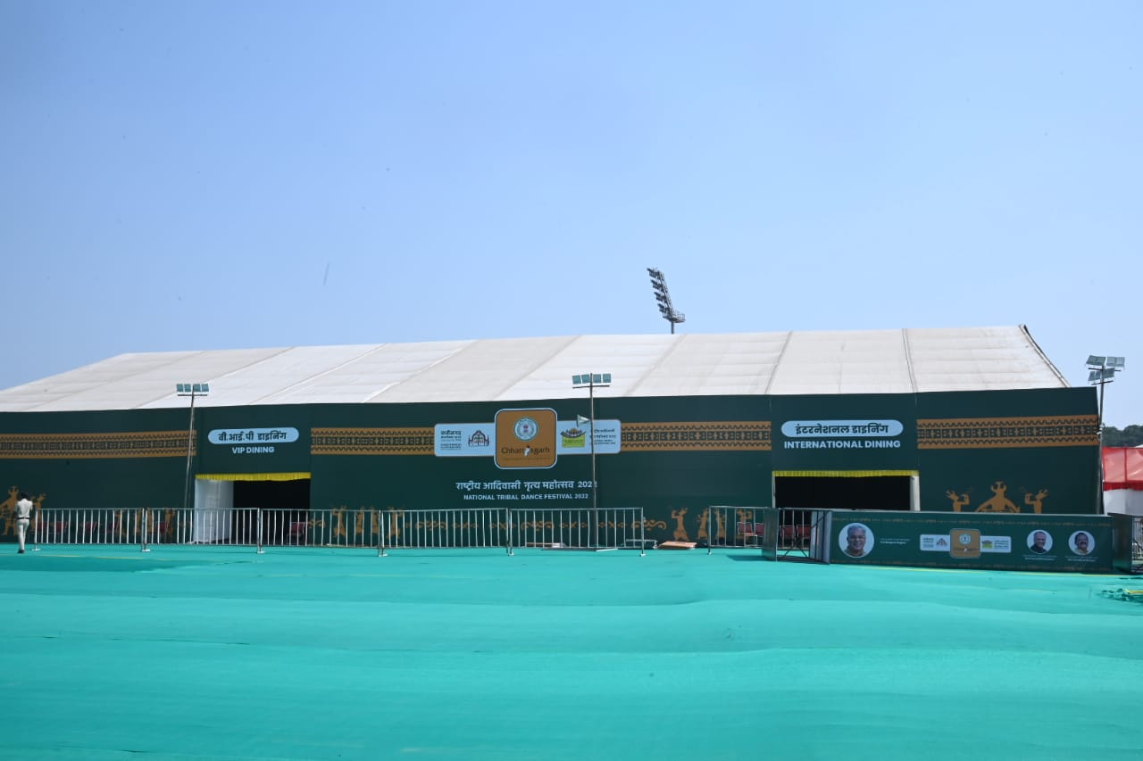 रायपुर, 31 अक्टूबर I छत्तीसगढ़ की राजधानी रायपुर के साइंस कॉलेज मैदान में 01 से 03 नवंबर तक आयोजित किए जा रहे राष्ट्रीय आदिवासी नृत्य महोत्सव और राज्योत्सव के लिए तैयारियां अंतिम चरण में हैं। साइंस कॉलेज मैदान में मुख्य मंच, विभिन्न विभागों के मंडप, स्टालों, प्रवेश द्वारों का निर्माण लगभग पूर्ण हो चुका है। राष्ट्रीय आदिवासी नृत्य महोत्सव के लिए देश-विदेश के मेहमान भी राजधानी रायपुर पहुंच चुके हैं और ये सिलसिला लगातार जारी है।