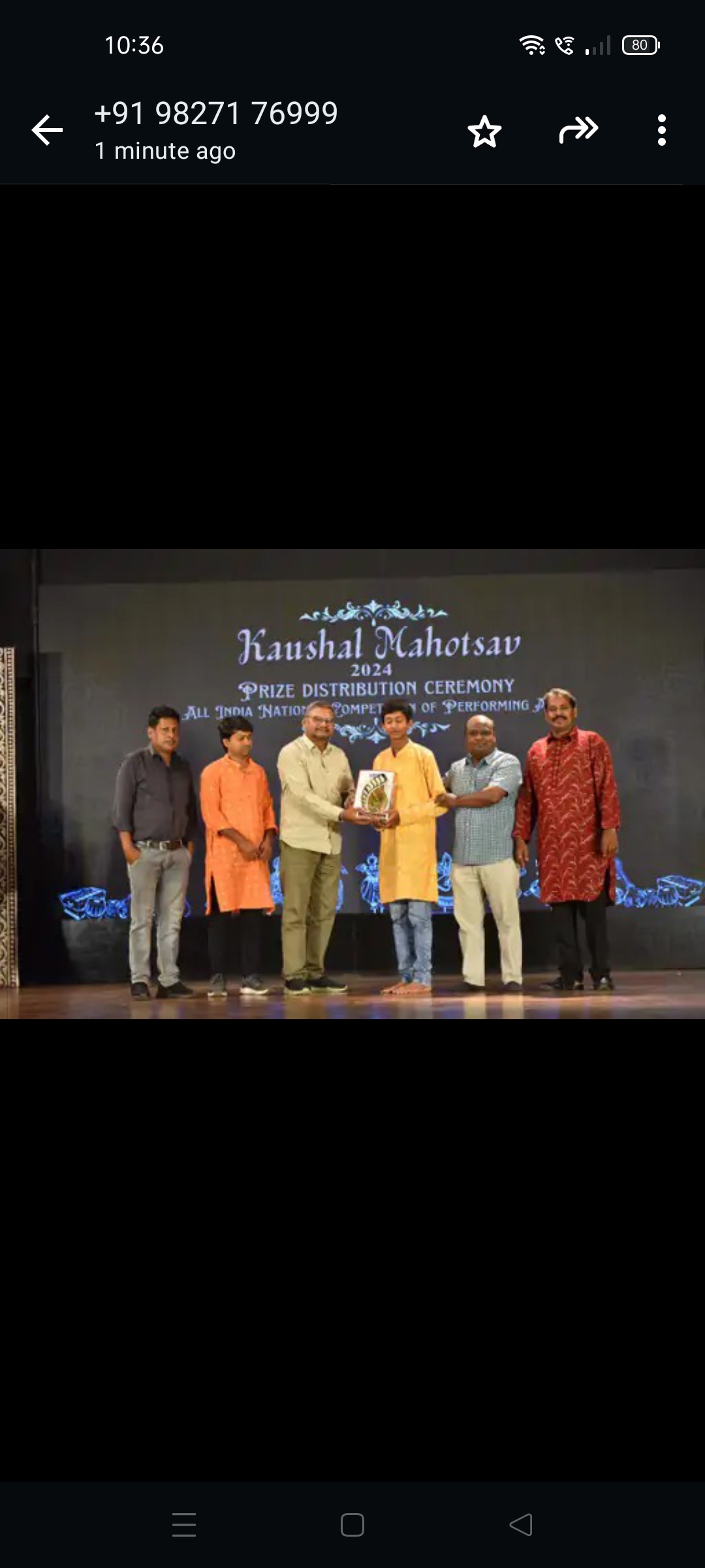 कोरबा : कौशल महोत्सव 2024 आल इंडिया नेशनल कंपीटिशन ऑफ परफॉर्मिंग आर्ट्स का आयोजन केपीएस कृष्णा ललित कला महाविद्यालय रामपुर द्वारा 2 से 7 जुलाई तक किया जा रहा है। इस प्रतियोगिता में नगर के पंजित विवेकशील पांडेय व स्मिता पांडेय के पुत्र प्रयत पांडेय को बेहतर प्रस्तुति के लिये ताल शिरोमणी सम्मान से सम्मानित किया गया। यह सम्मान तबला सीनियर केटेगरी में प्रथम स्थान हासिल करने पर दिया गया।