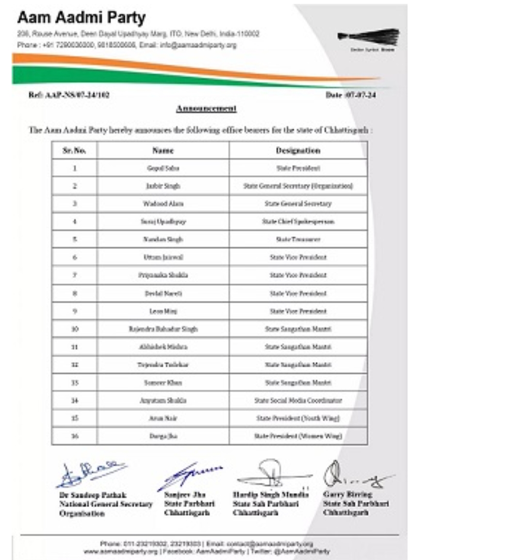 आम आदमी पार्टी ने गोपाल साहू को प्रदेश अध्यक्ष के अलावा जसबीर सिंह को प्रदेश महासचिव (संगठन), वदूद खान को प्रदेश महासचिव, नंदन सिंह को प्रदेश कोषाध्यक्ष और सूरज उपाध्याय को प्रदेश का मुख्य प्रवक्ता नियुक्त किया गया है. विधानसभा चुनाव में करारी हार के बाद से आम आदमी पार्टी में इस्तीफों का दौर शुरू हो गया था, जिसमें आप के खराब प्रदर्शन की जिम्मेदारी लेते हुए प्रदेश अध्यक्ष कोमल हुपेंडी ने इस्तीफा देने के चंद महीने बाद भाजपा का दामन थाम लिया था. शीर्ष नेतृत्व के इस्तीफे के बाद पर आप ने पार्टी का प्रदेश में नए सिरे से गठन किया है l
