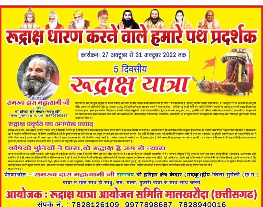 इस पाँच दिवसीय रुद्राक्ष यात्रा मालखरौदा क्षेत्र के 45 गांव में यात्रा कर 51हजार रुद्राक्ष निशुल्क वितरण करने का लक्ष्य रखा गया है।