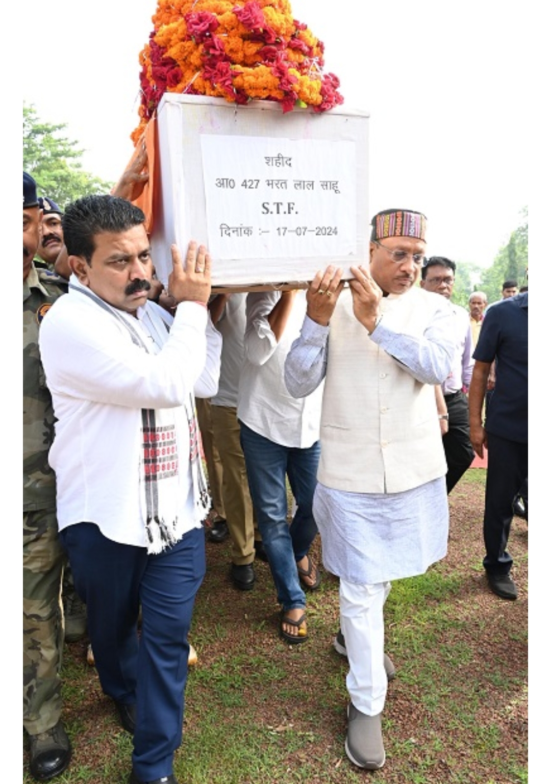 रायपुर। मुख्यमंत्री विष्णु देव साय और उपमुख्यमंत्री विजय शर्मा ने आज चौथी बटालियन माना पहुंचकर गत दिवस बीजापुर जिले के तर्रेम में माओवादियों द्वारा किये आईईडी ब्लास्ट में शहीद हुए जवान भरत लाल साहू के पार्थिव शरीर पर पुष्पचक्र अर्पित कर श्रद्धांजलि दी। मुख्यमंत्री और उपमुख्यमंत्री ने शहीद जवान के पार्थिव शरीर को कंधा देकर ससम्मान निवास रायपुर के सड्डू के लिए रवाना किया।