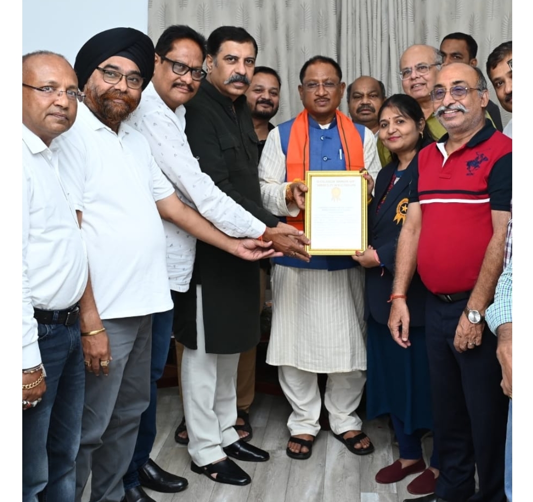 रायपुर । छत्तीसगढ़ चेंबर ऑफ कॉमर्स एंड इंडस्ट्रीज ने एक और ऐतिहासिक उपलब्धि हासिल करते हुए अपना नाम गोल्डन बुक ऑफ वर्ल्ड रिकॉर्ड में दर्ज करा लिया है। इस गौरवपूर्ण उपलब्धि पर प्रदेश के मुख्यमंत्री विष्णु देव साय ने चेंबर अध्यक्ष अमर पारवानी और उनकी टीम को स्मृतिचिन्ह और मेडल भेंट कर सम्मानित किया। इस अवसर पर रायपुर उत्तर विधानसभा विधायक पुरंदर मिश्रा भी उपस्थित रहे।