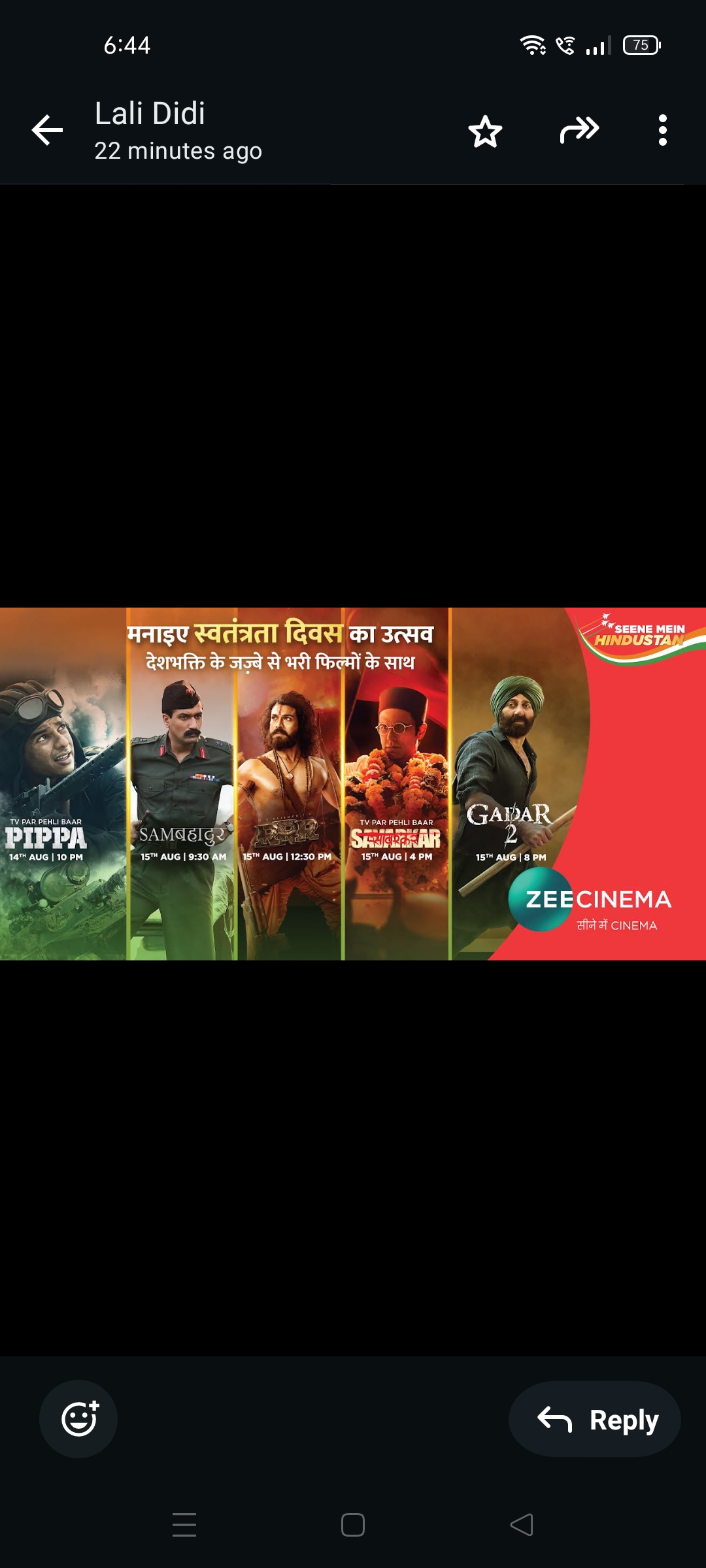 15 अगस्त को दोपहर 12:30 बजे एस.एस. राजामौली द्वारा निर्देशित ब्लॉकबस्टर फिल्म आरआरआर दिखाई जाएगी, जो अपनी भव्य कहानी और भारत के स्वतंत्रता संग्राम के गुमनाम नायकों के अद्भुत चित्रण से दर्शकों को आकर्षित करेगी। भव्य दृश्यों और एक दमदार कहानी के साथ यह फिल्म अपने प्रमुख किरदारों के वीरतापूर्ण कार्यों को बड़े प्रभावशाली अंदाज़ में सामने लाती है। 15 अगस्त को दोपहर 12:30 बजे यह ब्लॉकबस्टर प्रस्तुति देखने के लिए तैयार हो जाइए।