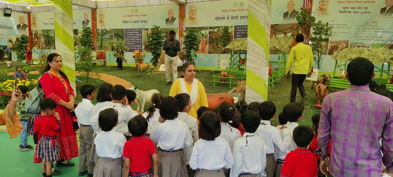 ऐसा ही कुछ हुआ राज्योत्सव के पशुधन विकास विभाग के स्टाल में। यहां पर नर्सरी के स्कूली बच्चों को स्टाल घुमाने लाया गया था। इन नौनिहालों को पशुधन विकास विभाग के द्वारा लगाया गया गोधन न्याय योजना का स्टाल इतना पसंद आया कि बच्चों के सवालों की बौछार शुरू हो गई। स्कूल के शिक्षकों को लगा की बच्चे परेशान कर रहे हैं तो उन्होंने बच्चों को चुप रहने की बात कही। लेकिन स्टाल में तैनात पशुधन विकास विभाग के अधिकारियों को इन मासूमों की उत्सुकता बेहत पसंद आई और इसे देखते हुए वहां मौजूद अधिकारी खुद शिक्षक बन गए। पशुधन विभाग के अधिकारियों ने न सिर्फ शिक्षक बन कर बच्चों के सवालों के जवाब दिए बल्कि बातों ही बातों को में पर्यावरण के प्रति जागरूकता और पशुधन से होने वाले लाभ के बारे में भी बच्चों को जागरूक कर दिया।