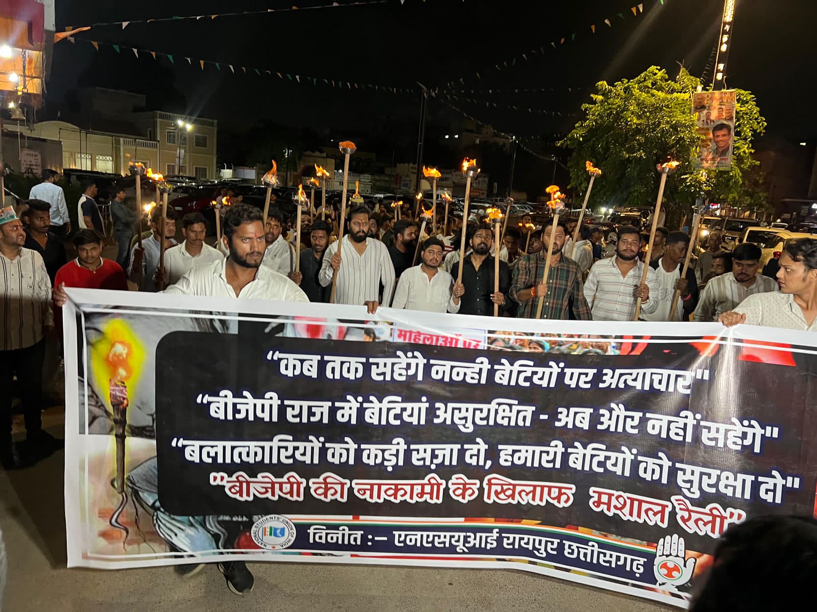 स्कूल पढ़ने वाली 4 साल की बच्ची से छेड़छाड़, भिलाई में युवती और राजधानी में अधेड़ महिला के साथ गैंगरेप का मामले को NSUI कार्यकर्ताओं ने मशाल रैली निकालकर जताया विरोध