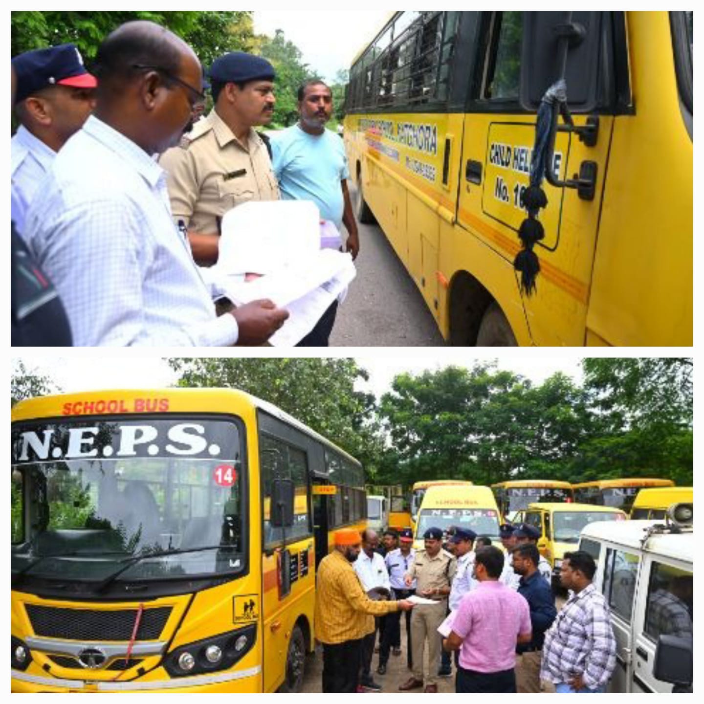 निरीक्षण दौरान विद्यालयीन वाहन को जांच करते समय उसमें पीला रंग है कि नहीं और आगे पीछे स्कूल बस लिखा है कि नहीं, बस में फर्स्ट ऐड किट, अग्नि श्मन यंत्र, नीचे बस्ता रखने की जगह, स्पीड गवर्नर, डोर लॉक सिस्टम आदि सही है कि नहीं आदि की सघन जांच की गयी।