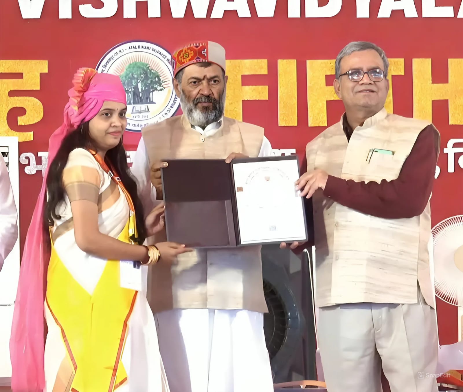 बीते दिनों विश्वविद्यालय परिसर बिलासपुर में आयोजित पंचम दीक्षांत समारोह में न्यायमूर्ति प्रशांत कुमार मिश्रा (भारतीय सर्वोच्च न्यायालय के मुख्य न्यायाधीश) के मुख्य आतिथ्य तथा रमेन डेका (राज्यपाल, छत्तीसगढ़ प्रदेश) की अध्यक्षता तथा विष्णुदेव साय (मुख्यमंत्री, छत्तीसगढ़ शासन), अरुण साव (उपमुख्यमंत्री, छत्तीसगढ़ शासन), तोखन साहू ( राज्यमंत्री, भारत सरकार) व रानी डेका काकोटी (प्रथम महिला, छत्तीसगढ़) के अति विशिष्ट आतिथ्य में अटल बिहारी वाजपेयी विश्वविद्यालय के कुलपति आचार्य एडीएन वाजपेयी तथा शहीद नंदकुमार पटेल विश्वविद्यालय के उपकुलपति ललित प्रकाश पटेरिया ने प्रशस्ति पत्र देकर सम्मानित किया।