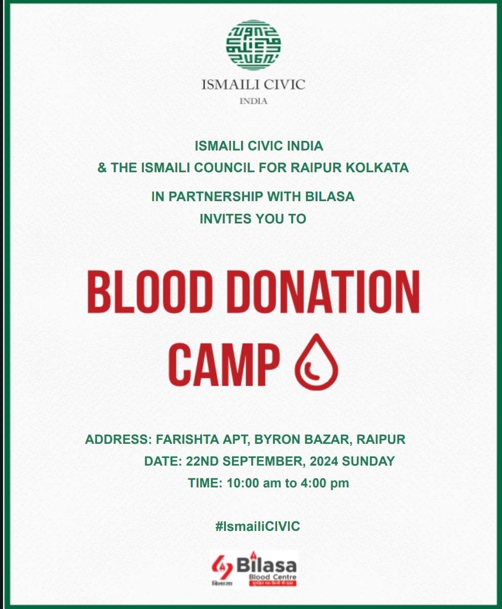 इस ब्लड डोनेशन कैंप का आयोजन इस्माईली सिविल इंडिया और बिलासा ब्लड सेंटर के तत्वावधान में किया जा रहा है। कार्यक्रम सुबह 10 बजे से दोपहर 4 बजे तक चलेगा। सभी इच्छुक नागरिकों से अपील की गई है कि वे इस सामाजिक कार्य में बढ़-चढ़कर हिस्सा लें और रक्तदान कर जरूरतमंदों की मदद करें।