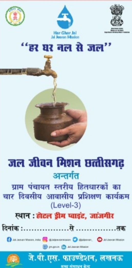 जांजगीर-चांपा 08 नवम्बर I जिला जल एवं स्वच्छता मिशन जांजगीर-चांपा एवं जे पी एस फाउंडेशन लखनऊ के तत्वावधान में जल जीवन मिशन अंतर्गत जांजगीर-चांपा जिले के ग्राम पंचायत स्तरीय हितधारकों का 4 दिवसीय आवासीय प्रशिक्षण कार्यक्रम आयोजित किया जा रहा है। 4 बैच के इस प्रशिक्षण का शुभारंभ होटल ड्रीम प्वाइंट जांजगीर में 9 नवंबर को प्रातः 10 बजे कलेक्टर तारन प्रकाश सिन्हा द्वारा किया जायेगा। 9 नवंबर से 12 नवंबर तक विकासखंड नवागढ़, 13 नवंबर से 16 नवंबर तक विकासखंड बम्हनीडीह, 17 नवंबर से 20 नवंबर तक विकासखंड पामगढ़ एवं 21 नवंबर से 24 नवंबर तक विकासखंड बलौदा के चयनित ग्राम पंचायतों के हितधारकों को प्रशिक्षण दिया जाएगा।