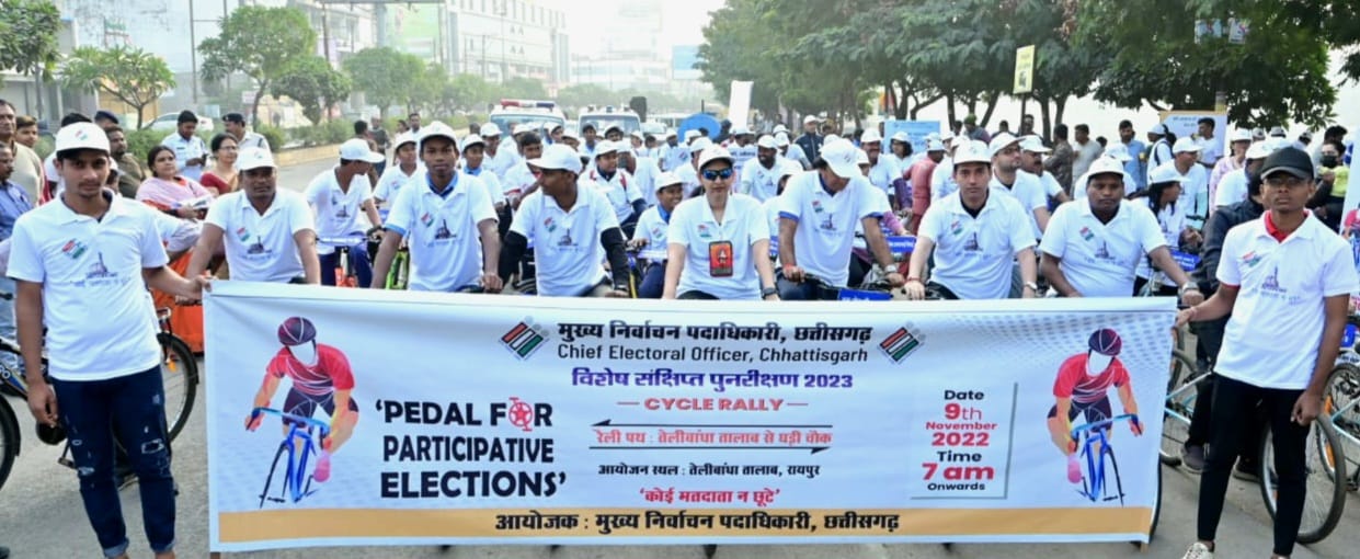 प्रसिद्ध समाज सेवी पद्मश्री से सम्मानित श्रीमती शमशाद बेगम और प्रसिद्ध पर्वतारोही एवं छत्तीसगढ़ के पीडब्ल्यूडी (PwD) स्टेट आइकॉन चित्रसेन साहू ने हरी झंडी दिखाकर रैली को रवाना किया। युवाओं को प्रेरित करने मुख्य निर्वाचन पदाधिकारी श्रीमती रीना बाबा साहेब कंगाले और पूर्व अंतरराष्ट्रीय क्रिकेटर राजेश चौहान ने भी रैली में सायकल चलाई। 1 जनवरी 2023 की स्थिति में मतदाता सूची के प्रारंभिक प्रकाशन के साथ ही मतदाता सूची का विशेष संक्षिप्त पुनरीक्षण आज से शुरू हो गया है। 1 जनवरी 2023, 1 अप्रैल 2023, 1 जुलाई 2023 और 1 अक्टूबर 2023 को 18 वर्ष पूरे करने वाले युवा अपना नाम जुड़वाने 9 नवम्बर 2022 से 8 दिसम्बर 2022 तक आवेदन कर सकते हैं।