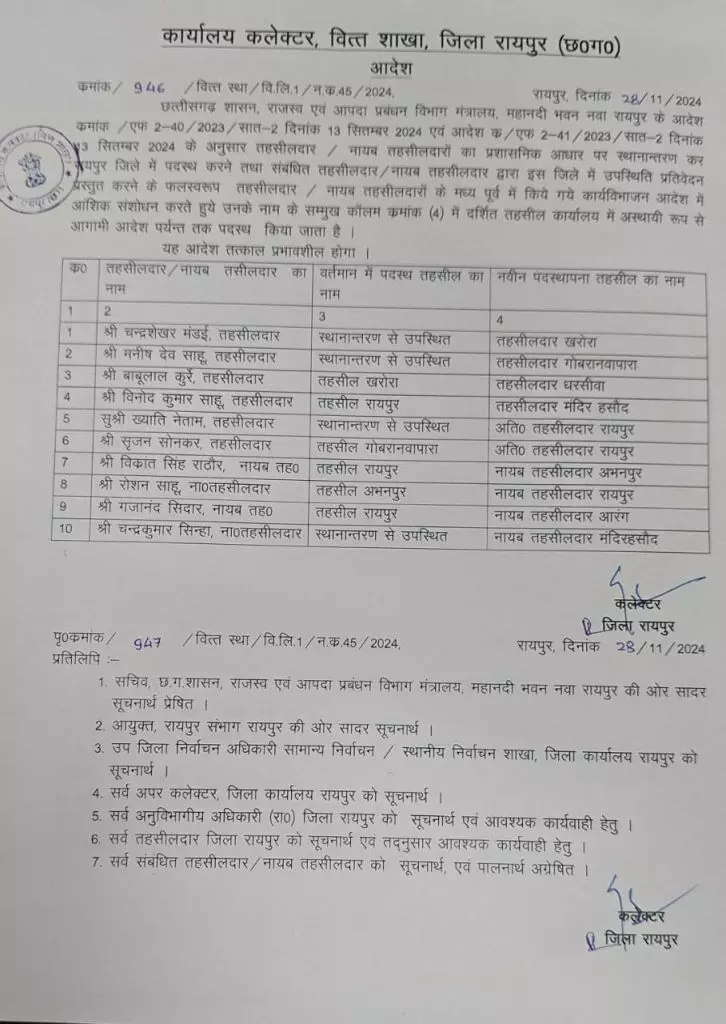 Chhattisgarhतहसीलदार ट्रांसफर: नीचे देखें लिस्ट… November 28, 2024November 28, 2024 - by NN Express रायपुर। राजधानी में पदस्थ तहसीलदार, नायब तहसीलदारों के तबादले हुये है। सूची में छह तहसीलदार और चार नायब तहसीलदारों के नाम शामिल है।