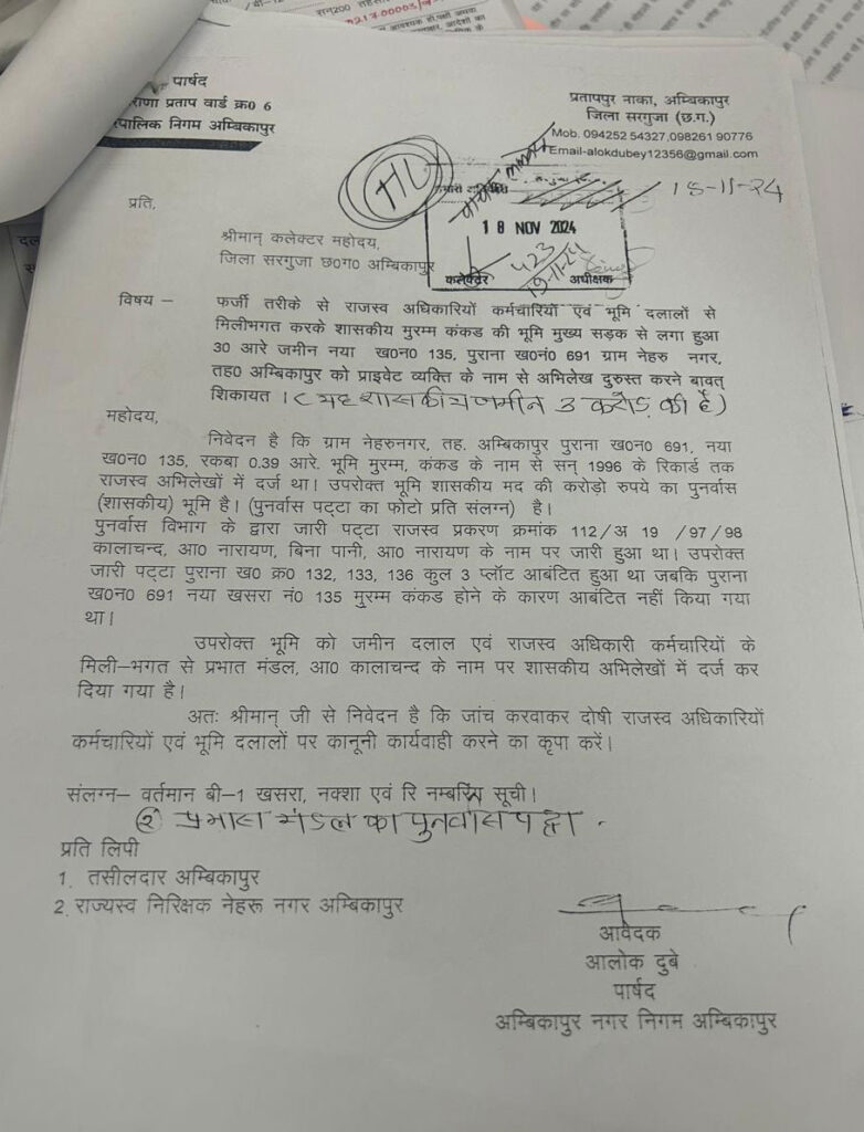 अंबिकापुर। अंबिकापुर से जमीन घोटाला का मामला उजागर हो गया है। जिस पर कलेक्टर विलास भोस्कर ने एक्शन लेते हुए चार करोड़ की जमीन घोटाला करने वाले पटवारी के खिलाफ FIR का आदेश दिया है। वहीं मामले में सरकारी जमीन को अपने नाम दर्ज कराने वाले आरोपी पर भी केस दर्ज किया जाएगा।