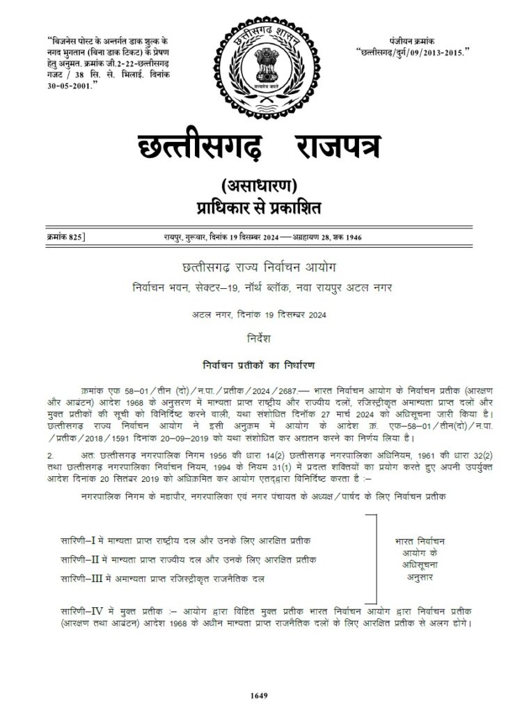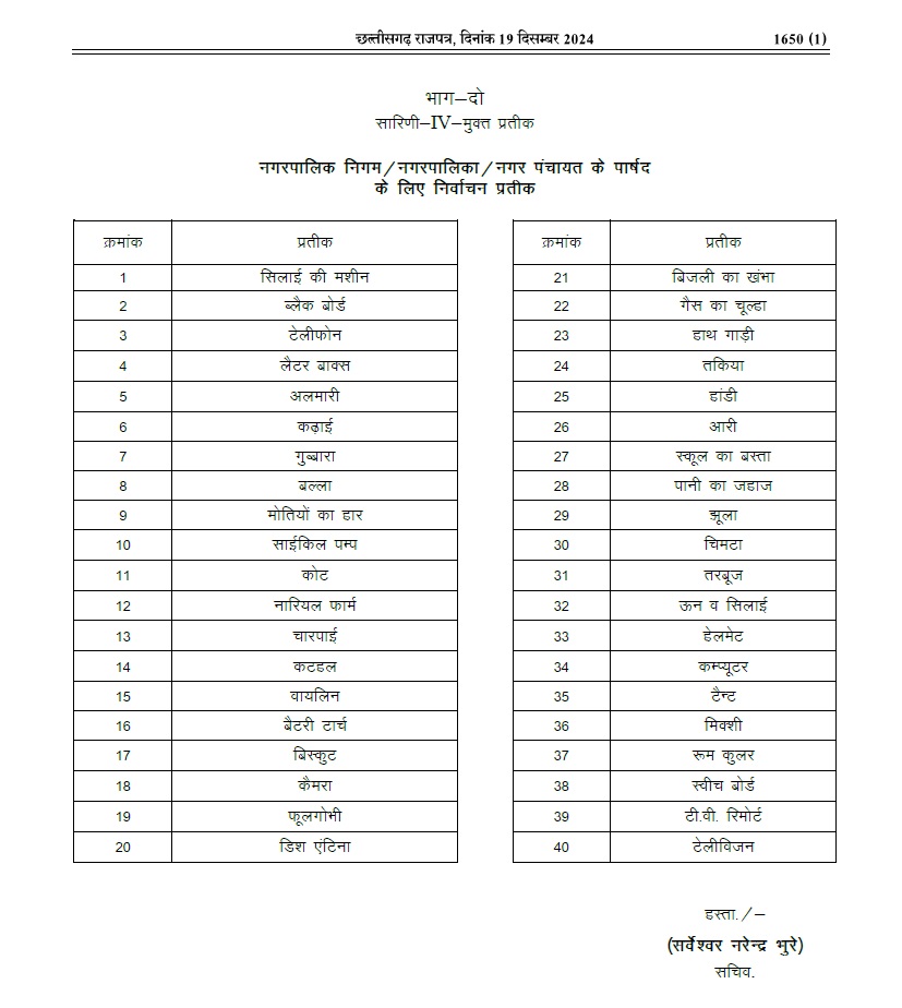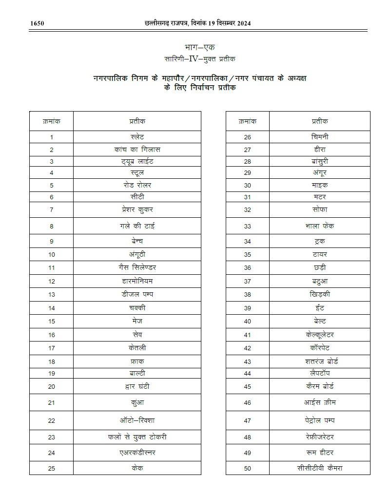 रायपुर । नगरीय निकाय चुनाव के लिए राज्य निर्वाचन आयोग ने प्रत्याशियों के लिए चुनाव चिन्ह जारी कर दिया है। इन चुनाव चिन्हों का उपयोग निर्दलीय प्रत्याशी के रुप में चुनाव लड़ने वाले कर सकते हैं। आयोग ने इसकी अधिसूचना जारी कर दी है। इमसें मेयर और अध्यक्ष का चुनाव लड़ने वालों के लिए 50 और पार्षद चुनाव लड़ने वालों के लिए 40 विकल्प दिए गए हैं।