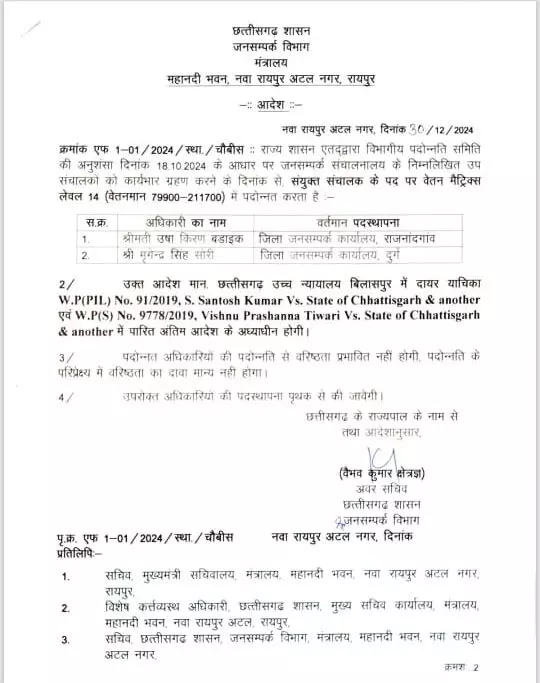 रायपुर । जनसंपर्क विभाग के अधिकारियों का प्रमोशन हुआ है। दो सहायक संचालकों को जहां उप संचालक के पद पर पदोन्नति दी गई है, वहीँ दो उप संचालकों को संयुक्त संचालक बनाया गया है।
