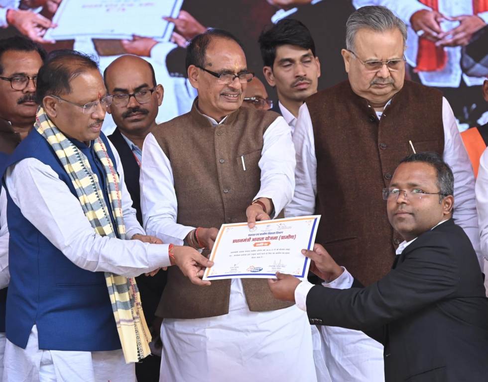 रायपुर । केन्द्रीय कृषि पंचायत एवं ग्रामीण विकास मंत्री शिवराज सिंह चौहान ने कहा है कि केन्द्र में प्रधानमंत्री नरेन्द्र मोदी और राज्य में विष्णु देव साय की डबल इंजन सरकार प्रदेश की तस्वीर और तकदीर बदलने के लिए पूरी निष्ठा से कार्य कर रही है। वे शुक्रवार को दुर्ग जिले के नगपुरा में आयोजित मोर आवास मोर अधिकार कार्यक्रम को सम्बोधित कर रहे थे। इस अवसर पर उन्होंने प्रधानमंत्री आवास योजना के हितग्राहियों के पैर पखार कर उनका अभिनंदन किया। केन्द्रीय मंत्री चौहान ने छत्तीसगढ़ में प्रधानमंत्री आवास योजना के तहत 3 लाख 3 हजार 384 नए आवासों की घोषणा की।