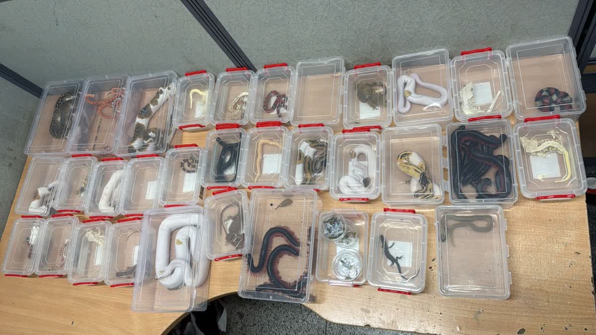 बॉक्स में थी विभिन्न छिपकलियां और मकड़ियां