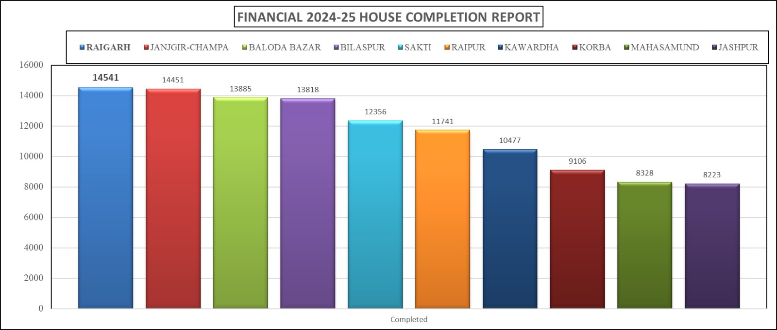 रायपुर । प्रधानमंत्री आवास योजना (ग्रामीण) के तहत रायगढ़ जिले ने पूरे छत्तीसगढ़ में अव्वल प्रदर्शन करते हुए एक मिसाल कायम की है। आवास निर्माण के क्षेत्र में रायगढ़ प्रदेश का नंबर एक जिला बन गया है। वर्ष 2024-25 में जिले को मिले 60,609 आवासों के लक्ष्य में से अब तक 52,307 आवासों को स्वीकृति दी जा चुकी है, और इनमें से 14,541 आवासों का निर्माण कार्य पूर्ण कर लिया गया है, जो पूरे राज्य में सर्वाधिक है।