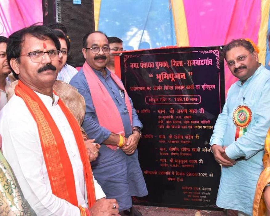 रायपुर. 30 अप्रैल 2025. उप मुख्यमंत्री अरुण साव राजनांदगांव के घुमका में विकास कार्यों के भूमिपूजन और मुख्यमंत्री सामूहिक कन्या विवाह योजना के अंतर्गत आयोजित सामूहिक विवाह में मुख्य अतिथि के रूप में शामिल हुए। उन्होंने घुमका नगर पंचायत में एक करोड़ 49 लाख रुपए से अधिक के विकास कार्यों का भूमिपूजन किया। उन्होंने इस मौके पर आयोजित कार्यक्रम में घुमका में विभिन्न कार्यों के लिए 50 लाख रुपए देने की घोषणा की। इनमें विद्युतीकरण के लिए नौ लाख 85 हजार रुपए, सड़क में बोर्ड लगाने के लिए नौ लाख 83 हजार रुपए तथा तीन द्वारों के लिए दस-दस लाख रुपए शामिल हैं। महिला एवं बाल विकास विभाग द्वारा घुमका में आयोजित सामूहिक विवाह में 20 जोड़े परिणय सूत्र में बंधे। श्री साव ने सभी जोड़ों को आशीष प्रदान करते हुए बधाई और शुभकामनाएं दीं। सांसद संतोष पाण्डेय और विधायक श्रीमती हर्षिता स्वामी बघेल भी दोनों कार्यक्रमों में शामिल हुईं।