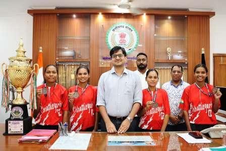 आज जिले के कलेक्टर संबित मिश्रा और डिप्टी कलेक्टर अकादमी के प्रभारी नारायण प्रसाद गवेल और साथ में उपस्थित श्रम निरीक्षक एवं अंतर्राष्ट्रीय कोच सोपान कर्णेवार के साथ खिलाड़ी रेणुका तेलम, विमला तेलम, चंद्रकला तेलम, ज्योति हेमला खिलाडियों को कलेक्टर मिश्रा के द्वारा मेडल पहनाया गया एवं उज्जवल भविष्य की कामना की और आने वाले भविष्य के लिए हार्दिक बधाइयां दी बस्तर यूनिवर्सिटी टीम में रेणुका और विमला दोनों ही अंतर्राष्ट्रीय भारतीय टीम का प्रतिनिधित्व पिछले साल कर चुके हैं ज्योति हेमला के द्वारा नेशनल गेम्स में पार्टिसिपेशन करते हुए छत्तीसगढ़ टीम को ब्रॉन्ज मेडल दिलाया था और वही इस सत्र रेणुका तेलम और चंद्रकला तेलम एक बार फिर से भारतीय टीम का प्रतिनिधित्व करेंगे।
