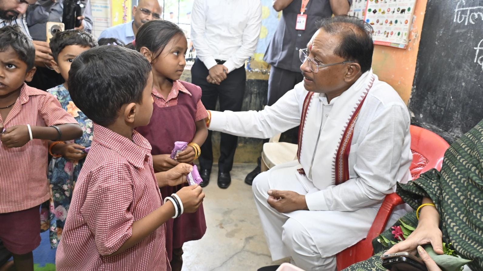 रायपुर, 28 मई 2025। सुशासन तिहार के तहत् मुख्यमंत्री विष्णु देव साय हेलीकॉप्टर से आज अचानक कांकेर जिले के मांदरी गांव पहुंचे। हेलीपेड से गांव के रास्ते पर आँगनबाड़ी भवन देखकर मुख्यमंत्री केंद्र के बच्चों से मिलने और वहां की व्यवस्था का जायजा लेने के लिए आंगनबाड़ी केंद्र पहुंचे। आँगनबाड़ी केंद्र में बच्चों ने मुख्यमंत्री का स्थानीय फूलों से तैयार किया गया गुलदस्ता भेंट कर स्वागत किया। मुख्यमंत्री ने बड़ी आत्मीयता के साथ बच्चों से घुल-मिल कर बातचीत की और उनसे आंगनबाड़ी और उनके अक्षर ज्ञान की जानकारी ली। मुख्यमंत्री के पूछने पर बच्चों ने धारा-प्रवाह कविता सुनाई। मुख्यमंत्री ने अपने हाथों से बच्चों को चाकलेट वितरित कर उन्हें दुलार किया। इस अवसर पर मुख्यमंत्री ने अधिकारियों से आँगनबाड़ी केंद्र में बच्चों को दी जाने वाली सुविधाओं और भोजन व्यवस्था की जानकारी भी ली और आवश्यक दिशा-निर्देश दिए।