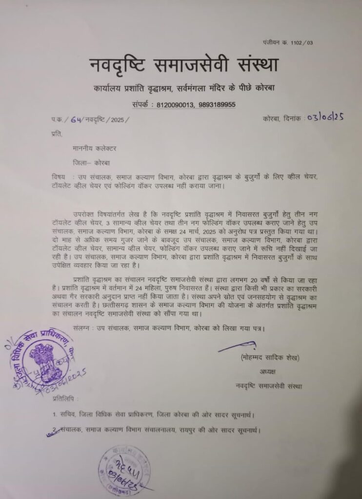 मामला प्रशांति वृद्धाश्रम से जुड़ा है। प्रशांति वृद्धाश्रम की संचालक संस्था द्वारा 24 मार्च, 2025 को समाज कल्याण विभाग, कोरबा की उप संचालक के समक्ष पत्र प्रस्तुत किया गया था। इस पत्र में वृद्धाश्रम में निवासरत बुजुर्गों के लिए तीन टॉयलेट व्हील चेयर, तीन सामानय व्हील चेयर एवं तीन नग फोल्डिंग वॉकर उपलब्ध कराने निवेदन किया गया था। दो माह से अधिक समय गुजर जाने के बाद भी समाज कल्याण विभाग, कोरबा की उप संचालक श्रीमती गोयल द्वारा बुजुर्गों के लिए व्हील चेयर उपलब्ध नहीं कराई गई। जबकि इस बीच सामग्री के लिए कार्यालय से संपर्क भी किया गया। 3 जून, 2025 को संस्था द्वारा इस संदर्भ में कलेक्टर तथा जिला विधिक सेवा प्राधिकरण को पत्र लिख गया और बताया कि लिखित में अनुरोध पत्र देने के दो माह से अधिक समय गुजर जाने के बाद भी व्हील चेयर फोल्डिंग वॉकर उपलब्ध नहीं कराया गया है। कलेक्टर एवं जिला विधिक सेवा प्राधिकरण को शिकायत पत्र प्रस्तुत करने के 15 दिनों बाद 18 जून, 2025 को समाज कल्याण विभाग द्वारा संस्था को बुजुर्गों के आधार कार्ड प्र्रस्तुत कर मांगी गई सामग्री प्राप्त करने कहा गया। यानी लगभग तीन माह तक समाज कल्याण विभाग ने जरूरतमंद बुजुर्गों को टॉयलेट एवं सामान्य व्हील, फोल्डिंग वॉकर उपलब्ध कराना जरूरी नहीं समझा। चुंकि टॉयलेट एवं सामान्य व्हील, फोल्डिंग वॉकर की अति आवश्यकता थी, इसलिए संस्था ने ढाई माह इंतजार करने के बाद अन्य संस्थाओं के सहयोग से उक्त सामग्री प्राप्त की। गौरतलब है कि प्रशांति वृद्धाश्रम का संचालन नवदृष्टि समाजसेवी संस्था द्वारा 20 वर्षों से किया जा रहा है। प्रशांति वृद्धाश्रम समाज कल्याण की योजना के अंतगर्त ही संचालित है। नवदृष्टि समाजसेवी संस्था वृद्धाश्रम के संचालन के लिए किसी भी प्रकार का शासकीय अथवा गैर शासकीय अनुदान प्राप्त नहीं किया जाता है। संस्था द्वारा अपने स्रोत तथा जनसहयोग से वृद्धाश्रम का संचालन किया जा रहा है। वृद्धाश्रम में वर्तमान में 24 बुजुर्ग निवासरत हैं। बुजुर्गों को भोजन सहित अन्य सुविधाएं निशुल्क उपलब्ध कराई जाती हैं।