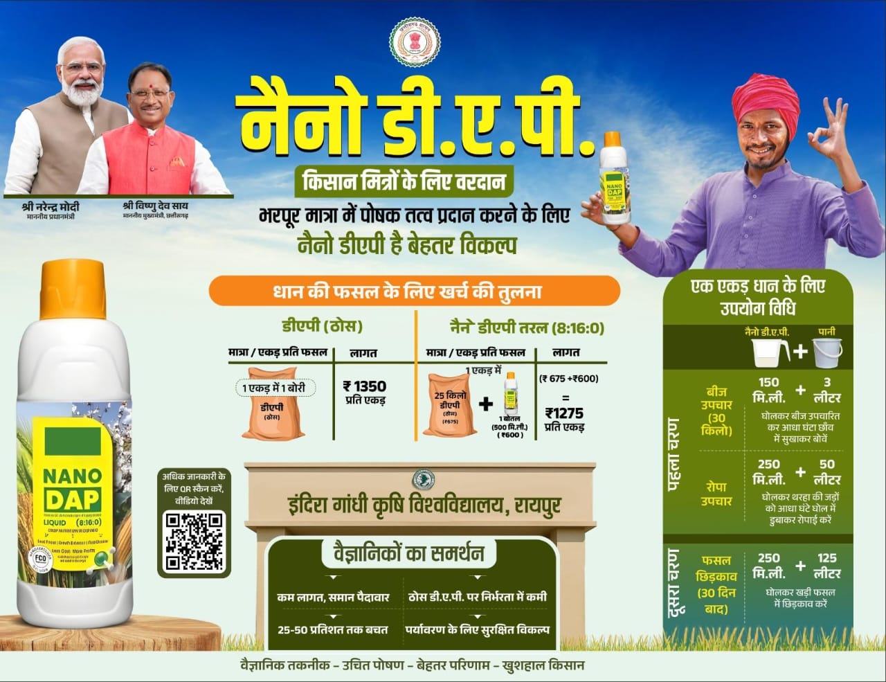इंदिरा गांधी कृषि विश्वविद्यालय के कृषि वैज्ञानिकों ने एक एकड़ धान की खेती के लिए नैनो डीएपी की उपयोग की विधि की विस्तार से जानकारी दी है। इसके अनुसार नैनो डीएपी की मात्र साढ़े 600 मिली मात्रा एक एकड़ धान की खेती में लगती है। धान की बुआई से पहले एक एकड़ के लिए 30 किलो बीज को 150 मिली नैनो डीएपी को तीन लीटर पानी में घोलकर उसमें बीज उपचारित कर आधा घंटा छाव में सुखाने के बाद बुआई की जाती है। रोपा के समय 50 लीटर पानी में 250 मिली नैनो डीएपी को मिलाकर उसमें थरहा की जड़ों को आधा घंटा डूबाकर रखने के बाद रोपाई तथा फसल बोआई के तीस दिन बाद 125 लीटर पानी में 250 मिली नैनो डीएपी को घोलकर खड़ी फसल पर इसका छिड़काव करना होता है। इससे फसलों को पोषक तत्व मिल जाते है।