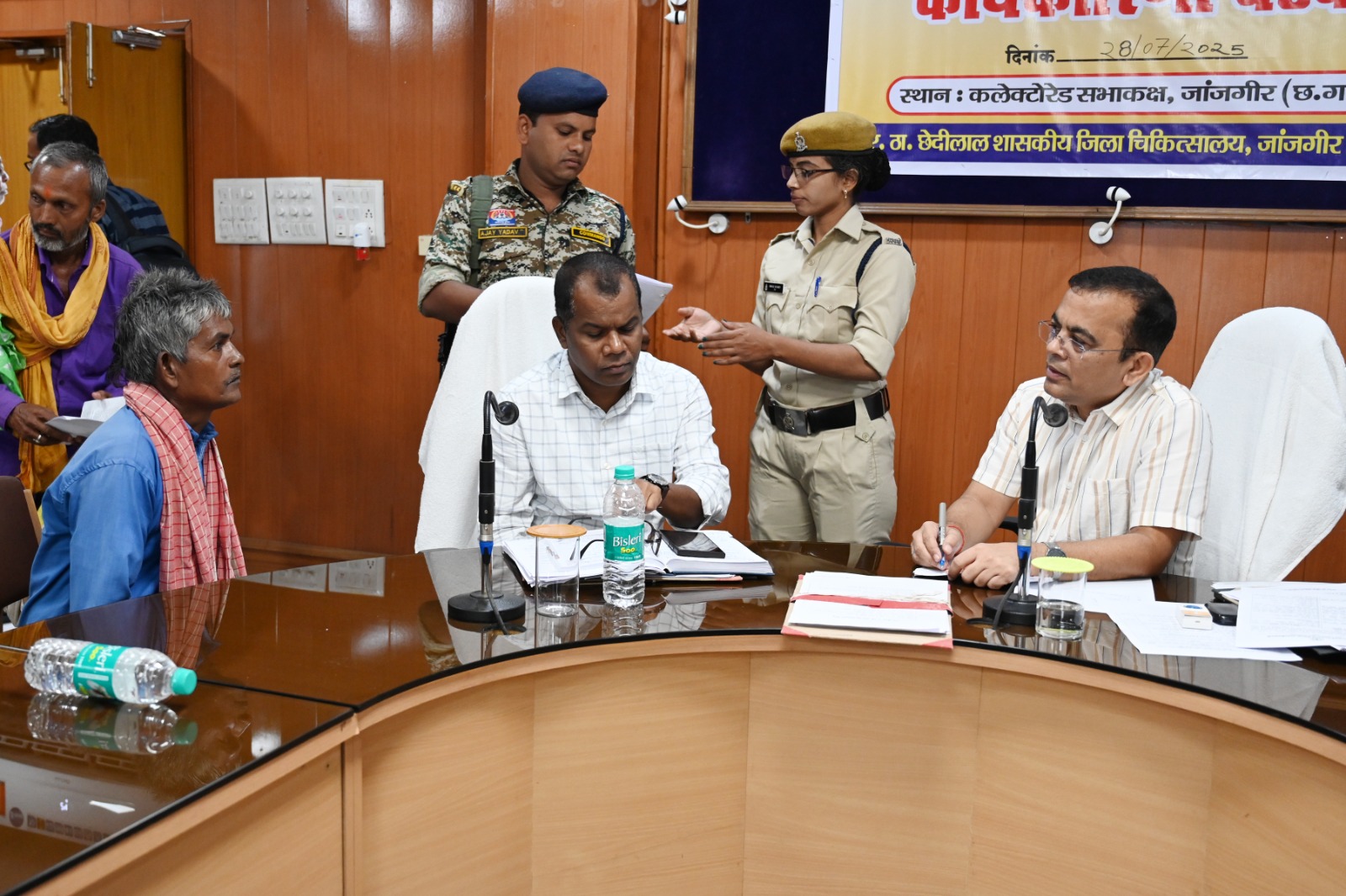 जांजगीर-चांपा, 28 जुलाई 2025। कलेक्टर जन्मेजय महोबे ने आज कलेक्टोरेट सभाकक्ष में आयोजित जनदर्शन कार्यक्रम के माध्यम से जिले के नागरिकों की समस्याएं, शिकायतें एवं मांगों को सुना तथा अधिकारियों को जनदर्शन में प्राप्त प्रत्येक आवेदन का संवेदनशीलता एवं प्राथमिकता के साथ गुणवत्तापूर्ण निराकरण करने के निर्देश दिए। जनदर्शन में आज कुल 42 आवेदन प्राप्त हुए।