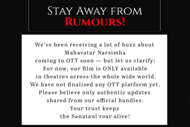 सोशल मीडिया पर यह ऐलान करते हुए मेकर्स ने लिखा –”हम ‘महावतार नरसिम्हा’ को लेकर दर्शकों के उत्साह और ओटीटी की चर्चा के लिए आभारी हैं — लेकिन फिलहाल, यह फिल्म केवल दुनियाभर के सिनेमाघरों में चल रही है।