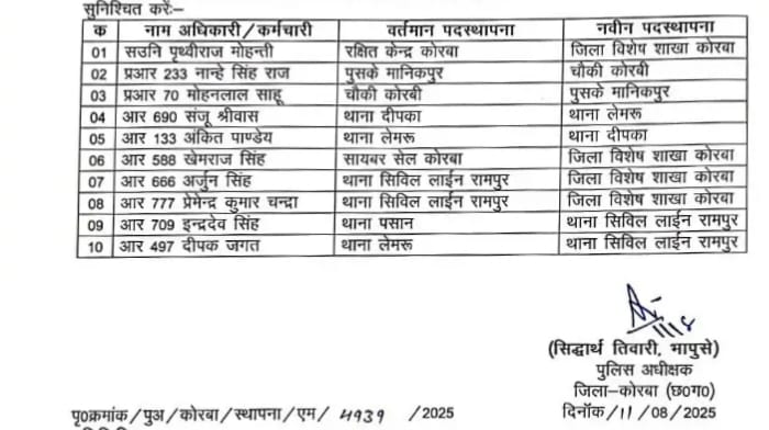 Chhattisgarhकोरबा: ASI मोहन्ती सहित 10 पुलिसकर्मियों का तबादला August 11, 2025August 11, 2025 - by NN Express कोरबा। जिला पुलिस अधीक्षक सिद्धार्थ तिवारी ने एक ASI पृथ्वीराज मोहंती, दो प्रधान आरक्षकों सहित कुल 10 पुलिस कर्मियों की पदस्थापना में फेरबदल किया