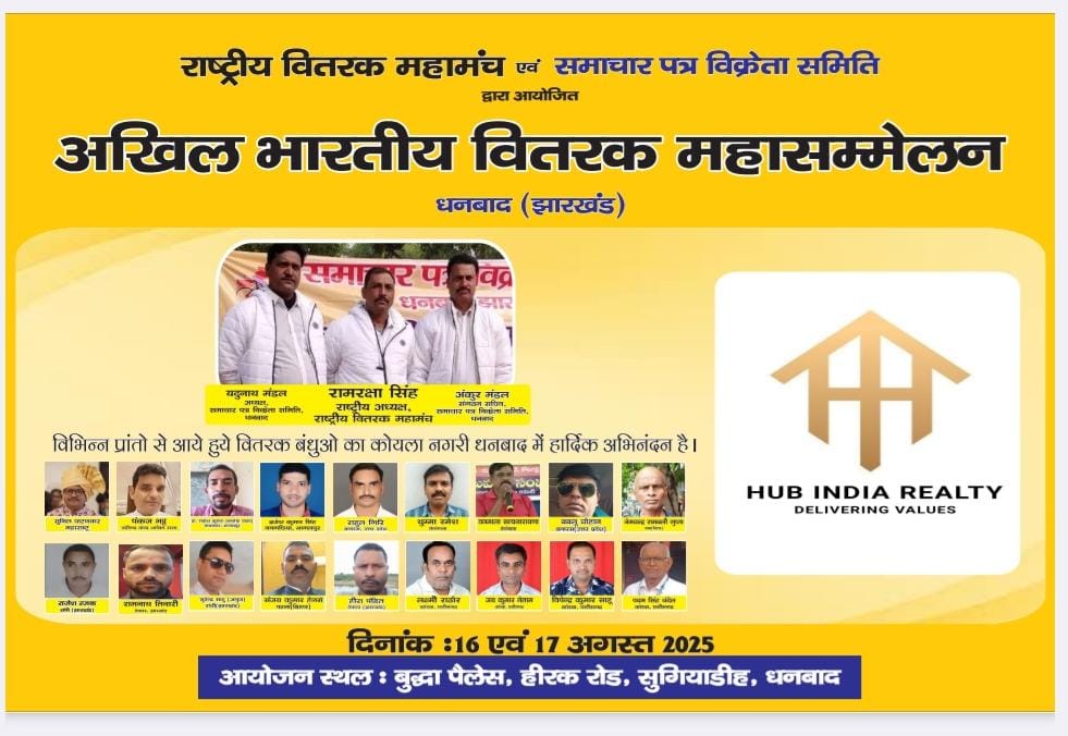 धनबाद, 13 अगस्त 2025: अखिल भारतीय समाचार पत्र विक्रेता सम्मेलन का आयोजन 16 और 17 अगस्त को धनबाद के बुद्धा लॉन, हीरक रोड, सुगियाडीह में किया जाएगा। इस सम्मेलन में देश के 22 राज्यों के प्रतिनिधि भाग लेंगे।