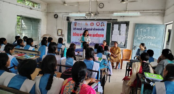 जांजगीर-चांपा 19 अगस्त 2025/ कलेक्टर जन्मेजय महोबे के निर्देशन बेटी बचाओ बेटी पढ़ाओ योजना के क्रियान्वयन में ’’बालिका सुरक्षा एवं कैरियर काउंसलिंग’’ थीम पर विकासखण्ड बम्हनीडीह अंतर्गत महारानी लक्ष्मीबाई शासकीय कन्या उच्चतर माध्यमिक विद्यालय में कार्यशाला का आयोजन किया गया।