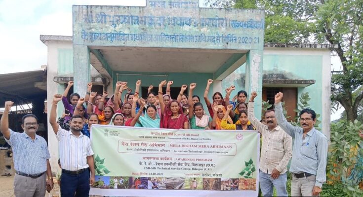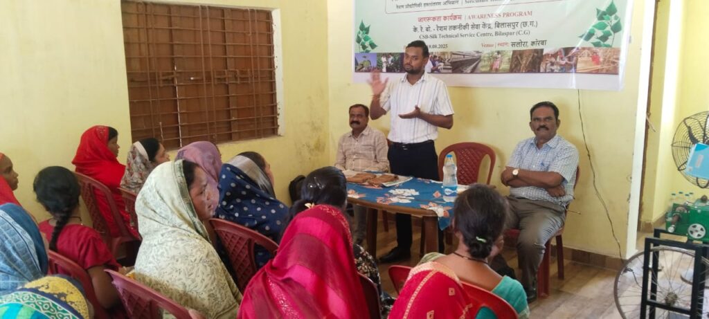मेरा रेशम मेरा अभिमान” अभियान के अंतर्गत केन्द्रीय रेशम बोर्ड – रेशम तकनीकी सेवा केंद्र (सीएसबी-एसटीएससी), बिलासपुर द्वारा सोमवार 18 अगस्त को ग्राम सलोरा में जागरूकता कार्यक्रम आयोजित किया गया। कार्यक्रम में लगभग 60 प्रतिभागियों ने उत्साहपूर्वक भाग लिया, जिनमें अधिकांश महिलाएँ थीं। कार्यक्रम में बी.एस. भंडारी, सहायक संचालक, रेशम, कोरबा ने मुख्य अतिथि के रूप में उपस्थिति दर्ज कराते हुए प्रतिभागियों को नई तकनीकों को अपनाने हेतु प्रेरित किया तथा विभाग द्वारा हरसंभव सहयोग का आश्वासन दिया।