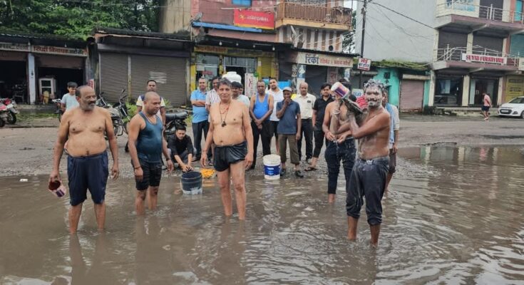 कोरबा। सड़कों पर जगह-जगह गड्ढों से शहरवासी परेशान हैं. कोरबा जिले के कुसमुंडा क्षेत्र में सड़क की समस्या को लेकर व्यापारियों ने अनोखा विरोध प्रदर्शन किया. व्यापारियों ने सड़क पर गड्ढों वाले स्थान पर बाल्टी मंगाकर गड्ढों में भरे पानी से नहाकर विरोध जताया.
