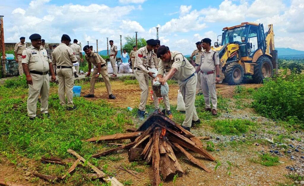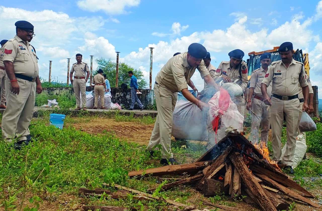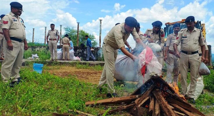 एमसीबी,28 अगस्त 2025। जिले में नशे के कारोबार पर कड़ी कार्रवाई करते हुए पुलिस प्रशासन ने एक बड़ी उपलब्धि हासिल की है। पुलिस महानिरीक्षक सरगुजा रेंज सरगुजा के स्पष्ट निर्देशों के तहत आज जिले के थाना जनकपुर, चिरमिरी, खड़गवां, पोंड़ी एवं मनेन्द्रगढ़ में वर्ष 2022, 2023, 2024 एवं 2025 तक नारकोटिक्स एक्ट के तहत जप्त किए गए मादक पदार्थों का सार्वजनिक रूप से नष्टीकरण किया गया। इस कार्रवाई के दौरान 129.95 किलोग्राम गांजा जिसकी बाजार कीमत लगभग 12 लाख 33 हजार 900 रुपये आंकी गई, इसके अलावा 272 नग नशीली इंजेक्शन एवं 122 नग नशीली टेबलेट जिनकी कीमत 7381 रुपये रही, जिसको विधिवत नष्ट किया गया। कुल मिलाकर लगभग 12 लाख 41 हजार 281 रुपये के नशीले पदार्थों का नष्टीकरण पुलिस अधीक्षक चन्द्रमोहन सिंह की उपस्थिति में किया गया। यह कार्रवाई जिले में नशे के खिलाफ चलाए जा रहे अभियान की गंभीरता और सफलता को दर्शाती है। नष्टीकरण की इस प्रक्रिया में एसडीओपी मनेन्द्रगढ़ एलेक्स टोप्पो, एसडीओपी भरतपुर आर. के. मिश्रा, सीएसपी चिरमिरी श्रीमती दीपिका मिंज, उप पुलिस अधीक्षक (मुख्यालय) श्रीमती तरसीला टोप्पो सहित आबकारी निरीक्षक मनेन्द्रगढ़ श्रीमती शशिकला पैकरा, उप निरीक्षक थाना प्रभारी खड़गवां विजय सिंह, सहायक उप निरीक्षक थाना प्रभारी खड़गवा, विनय तिवारी, सहायक उप निरीक्षक थाना प्रभारी चिरमिरी विपीन मिंज, सहायक उप निरीक्षक थाना प्रभारी मनेन्द्रगढ़ अभिषेक पाण्डेय, सहायक उप निरीक्षक थाना प्रभारी जनकपुर दिनेश चौहान, प्र.आर. पुरुषोत्तम बघेल डीसीबी प्रभारी पुलिस अधीक्षक कार्यालय एमसीबी तथा जिले के अन्य पुलिस अधिकारी-कर्मचारी उपस्थित रहे।