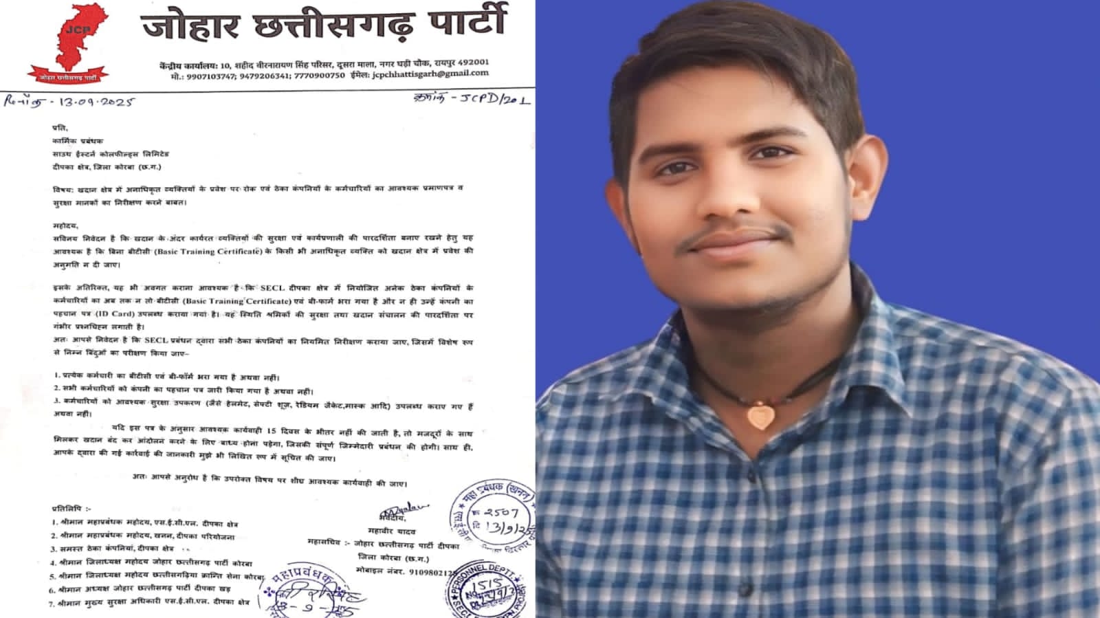 दीपका/कोरबा। एसईसीएल दीपका क्षेत्र में श्रमिक सुरक्षा को लेकर एक बार फिर गंभीर सवाल उठे हैं। जोहार छत्तीसगढ़ पार्टी (JCP) के महासचिव महावीर यादव ने शुक्रवार को प्रबंधन को पत्र लिखकर खदान परिसर में व्याप्त कथित अनियमितताओं पर कड़ा विरोध दर्ज कराया।
