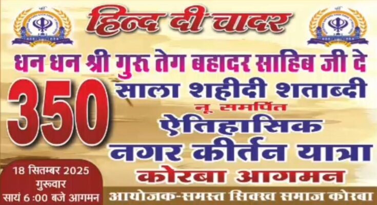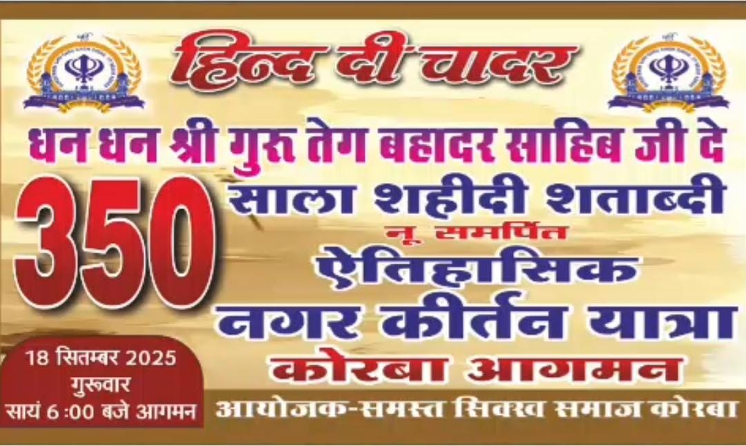 कोरबा, 17 सितम्बर। सिख पंथ के नौवें गुरु, मानवता और शहीदी के प्रतीक धन धन श्री गुरु तेग बहादर साहिब जी की 350वीं शहीदी शताब्दी के पावन उपलक्ष्य में एक विशाल धार्मिक यात्रा का आयोजन किया जा रहा है। यह ऐतिहासिक यात्रा 21 अगस्त 2025 को असम के श्री गुरुद्वारा डुबरी साहिब से आरंभ हुई है। यात्रा भारत के विभिन्न राज्यों के ऐतिहासिक गुरुद्वारों और पवित्र स्थलों से होती हुई आगे बढ़ रही है।