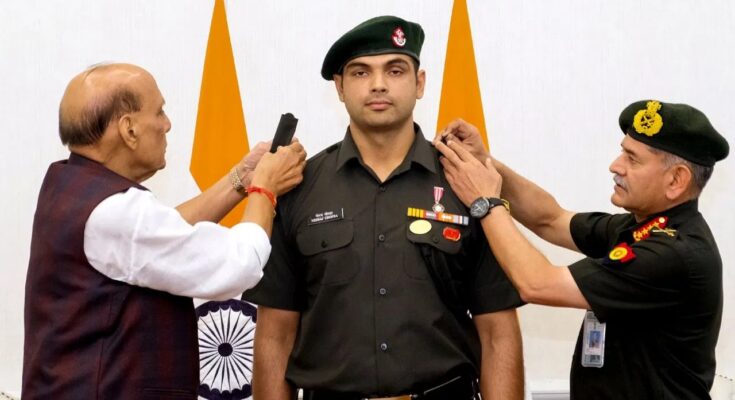 भारत के गोल्डन बॉय नाम से मशहूर जेवलिन थ्रो स्टार नीरज चोपड़ा को एक बड़ा सम्मान मिला है. देश का नाम रोशन करने के लिए उन्हें टेरिटोरियल आर्मी में ऑनरेरी लेफ्टिनेंट कर्नल की मानद उपाधि से सम्मानित किया गया है. रक्षा मंत्री राजनाथ सिंह और थल सेना अध्यक्ष उपेंद्र द्विवेदी ने दिल्ली में नीरज को सितारे लगाकर शुभकामनाएं दीं. इससे पहले वह सूबेदार मेजर थे. टोक्यो ओलंपिक में गोल्ड मेडल और पेरिस ओलंपिक में सिल्वर मेडल जीतने वाले नीरज चोपड़ा पिछले 9 साल से भारतीय सेना से जुड़े हैं.