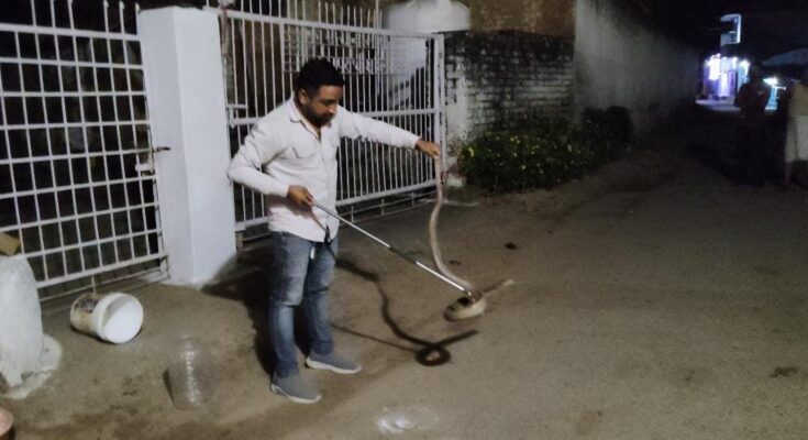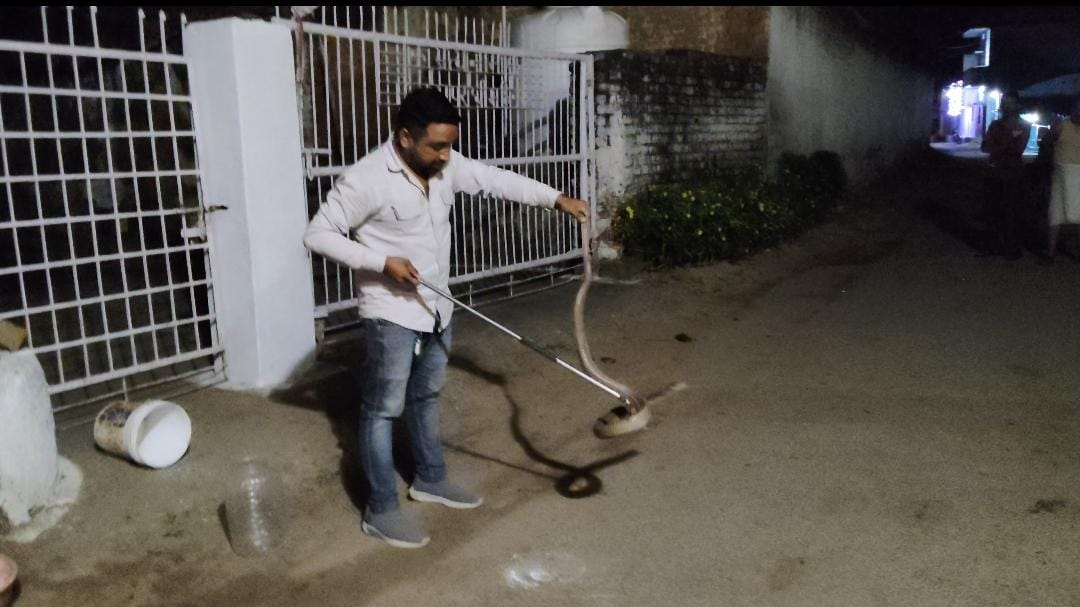 कोरबा। कोरबा शहर से 20 किलोमीटर दूर कुदुरमाल गांव में उस समय हड़कंप मच गया जब गली में बैठे ग्रामीणों ने अपने तरफ आते एक बेहद बड़े नाग को देखा, देखते ही देखते लोगों की भीड़ इकट्ठा हो गई, इतने बड़े नाग को देख कर बच्चे, महिलाएं एवं वरिष्ठ जन हक्के बक्के रह गए की आखिरकार इतना बड़ा नाग आया कहा से फिर गांव के ही हरिशंकर पटेल ने बड़ी बहादुरी से एक किनारे बाल्टी को रख दिया जिसमें वो नाग घुस गया और कुण्डी मार कर बैठ गया फिर बाल्टी को सीधा कर के ढक दिया गया फिर गांव के युवक हरिशंकर पटेल ने इसकी जानकारी वाइल्डलाइफ रेस्क्यु टीम प्रमुख सदस्य जितेंद्र सारथी को दिया गया जिस पर सारथी ने थोड़ी देर में पहुंचने की बात कही तब तक गांव वाले वहीं बैठ कर रेस्क्यु टीम आने का इंतजार करते रहे आखिरकार कुछ घंटे के बाद जितेंद्र सारथी अपने टीम राजू बर्मन, बबलू मारवा, शुभम के साथ वहां पहुंचे और बड़ी सावधानी से बाल्टी के अंदर से 6 फिट के विशालकाय नाग को बाहर निकाला और बड़ी ही सावधानी से कोबरा को डिब्बे में रखा, पूरे रेस्क्यु ऑपरेशन को देख कर गांव वाले हक्के बक्के रह गए साथ ही सुरक्षित महसूस करने लगे फिर गांव वालों ने रेस्क्यु टीम का धन्यवाद ज्ञापित किया फिर नाग को सुरक्षित उसके प्राकृतिक रहवास जंगल में छोड़ दिया गया।