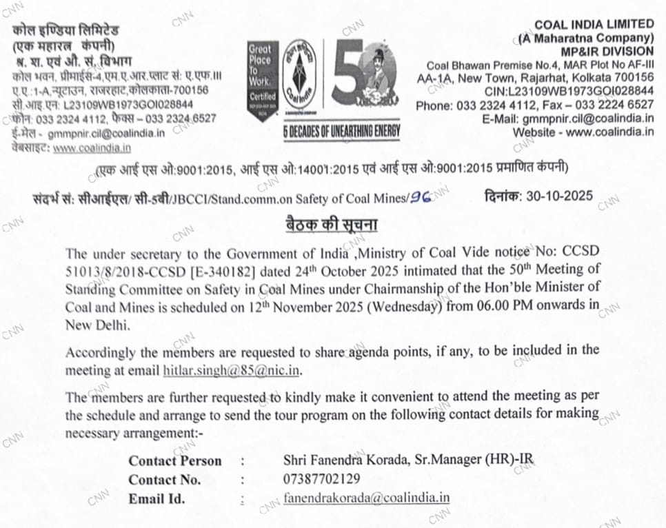 नई दिल्ली। कोयला खदानों की सुरक्षा से जुड़ी स्टैंडिंग कमेटी ऑन सेफ्टी इन कोल माइंस की 50वीं बैठक 12 नवंबर को नई दिल्ली में आयोजित होगी। बैठक शाम 6 बजे से प्रारंभ होगी, जिसकी अध्यक्षता केंद्रीय कोयला मंत्री जी. किशन रेड्डी करेंगे।