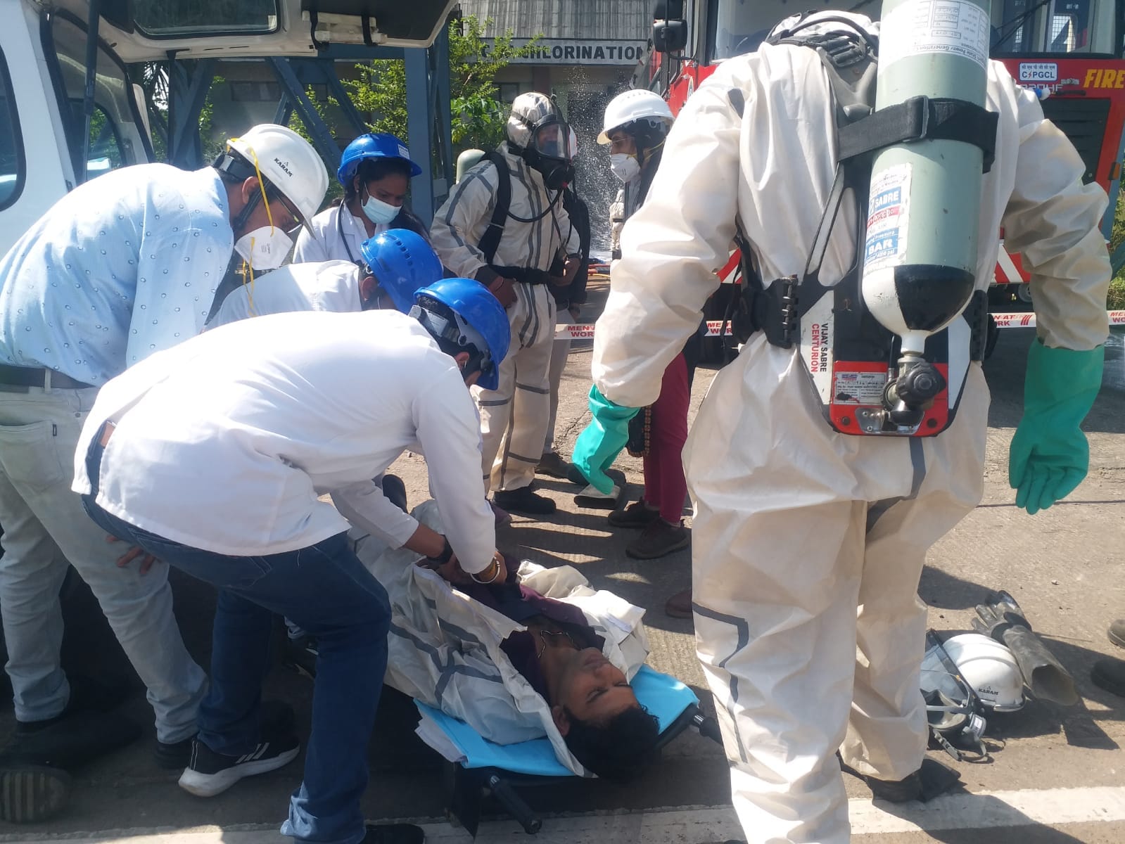 कोरबा 04 नवंबर 2025- हसदेव ताप विद्युत गृह कोरबा पश्चिम में उस समय हड़कंप मच गया जब क्लोरीनेशन प्लांट में हताहत होने की सूचना आपात स्थिति नियंत्रक केंद्र को दी गई। केवल 45 सेंकड में रिस्पांस करते हुए सुबह के 11.59 बजे अग्निशमन कर्मचारी अपने वाहन के साथ पहुंचे और तुरंत ही क्लोरीनेशन प्लांट के सामने पानी की बौछार कर एक वाटर कर्टेन तैयार किया ताकि वहां पर क्लोरीन गैस के रिसाव को रोका जा सके। क्लोरीनेशन प्लांट के अंदर एक कर्मचारी फिसलकर गिर गया था जिससे वह चोटिल हो गया। उसे अग्निशमन कर्मचारियों द्वारा रेसक्यू किया गया।
