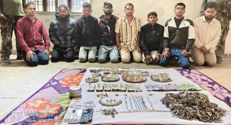 बलरामपुर, 09 नवम्बर। छत्तीसगढ़ के बलरामपुर में 30-31 अक्टूबर की रात धनंजय ज्वेलरी दुकान में हुई चोरी मामले का पुलिस ने पर्दाफाश कर दिया है. चोरी की घटना में शामिल 9 आरोपियों को गिरफ्तार किया गया है. हालांकि इनमें से एक आरोपी उमेश सिंह की पुलिस की गिरफ्तारी के बाद तबीयत बिगड़ गई, जिसके बाद इलाज के दौरान उसने दम तोड़ दिया. मामले की जांच के लिए टीम गठित की गई है. चोरी मामले में आरोपियों के कब्जे से सोना-चांदी, 3.5 लाख रुपए कैश, 4 टू-व्हीलर और 2 आईफोन बरामद किया गया है. जिनकी कुल कीमत 50 लाख रुपए के करीब बताई जा रही है.